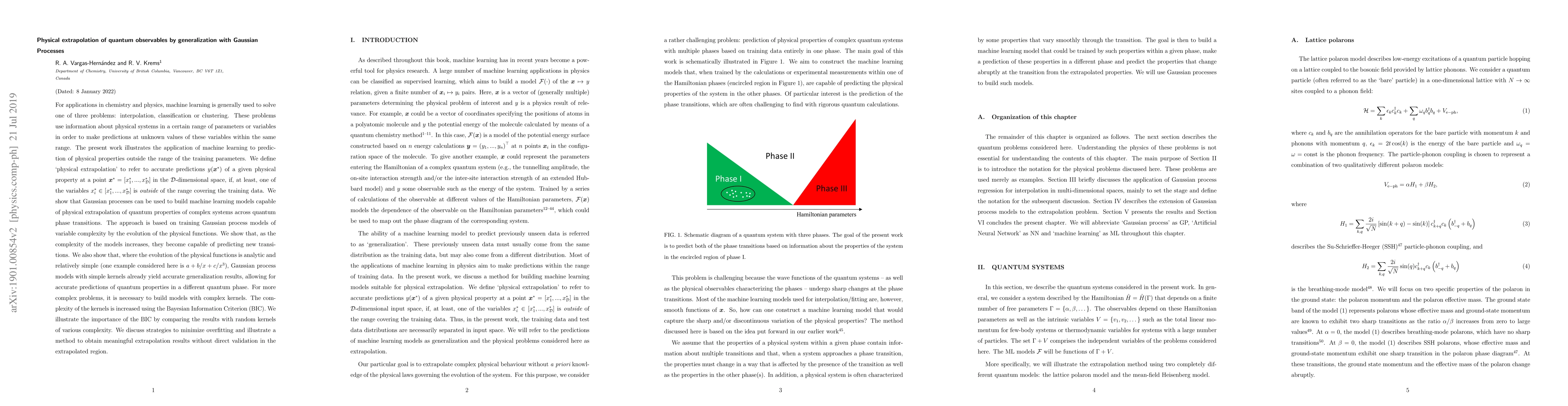 For applications in chemistry and physics, machine learning (ML) is generally used to solve one of three problems: interpolation, classification or clustering. These problems use information about physical systems in a certain range of parameters or variables in order to make predictions at unknown values of these variables within the same range. The present work illustrates the application of ML to prediction of physical properties outside the range of the training parameters. We define `physical extrapolation' to refer to accurate predictions $y(\mathbf{x^\ast})$ of a given physical property at a point $\mathbf{x^\ast} = [ x^\ast_1, ..., x^\ast_{\cal D} ]$ in the $\cal D$-dimensional space, if, at least, one of the variables $x^\ast_i \in \left [ x^\ast_1, ..., x^\ast_{\cal D} \right ]$ is {\it outside} of the range covering the training data. We show that Gaussian processes (GPs) can be used to build ML models capable of physical extrapolation of quantum properties of complex systems across quantum phase transitions. The approach is based on training GP models of variable complexity by the evolution of the physical functions. We show that, as the complexity of the models increases, they become capable of predicting new transitions. We also show that, where the evolution of the physical functions is analytic and relatively simple, GP models with simple kernels already yield accurate generalization results, allowing for accurate predictions of quantum properties in a different quantum phase. For more complex problems, it is necessary to build models with complex kernels. The complexity of the kernels is increased using the Bayesian Information Criterion (BIC). We illustrate the importance of the BIC by comparing the results with random kernels of various complexity and illustrate a method to obtain meaningful extrapolation results without direct validation in the extrapolated region.