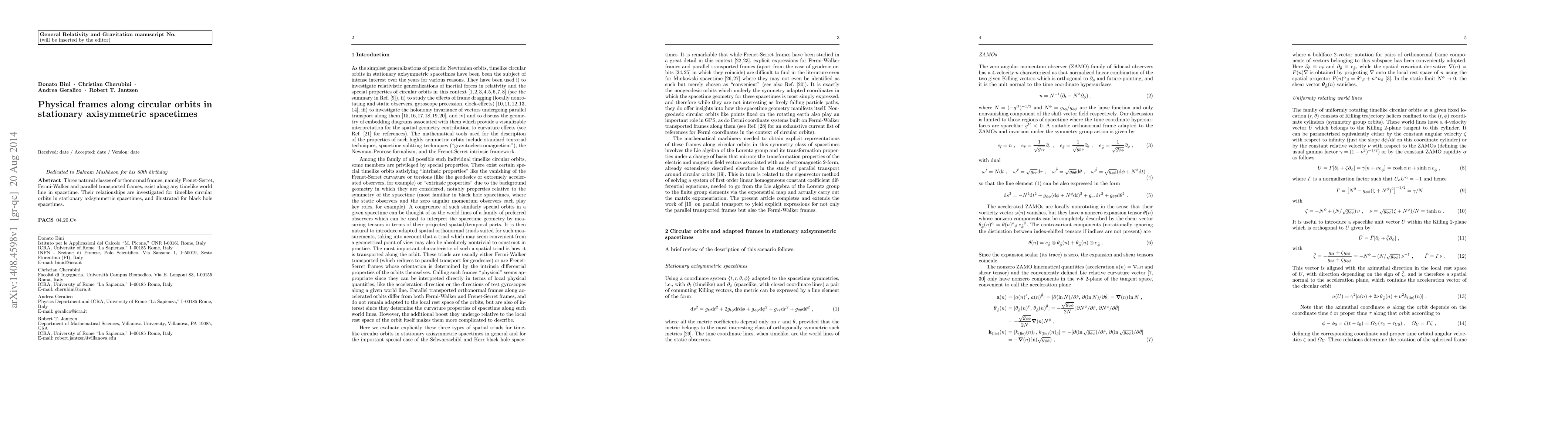 This paper investigates the relationships between Frenet-Serret, Fermi-Walker, and parallel transported orthonormal frames along timelike circular orbits in stationary axisymmetric spacetimes, with a focus on black hole spacetimes to illustrate these relationships.