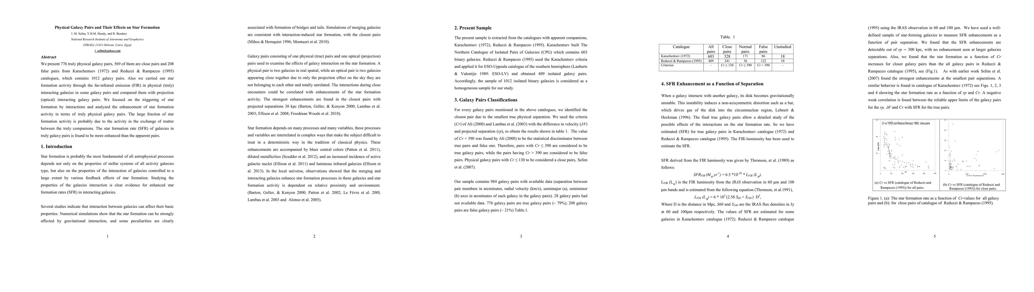 The study extracted 776 physical galaxy pairs from Karachentsev (1972) and Reduzzi & Rampazzo (1995) catalogues using the Cr criterion to classify true and false pairs. SFR was estimated using FIR luminosity from IRAS observations.