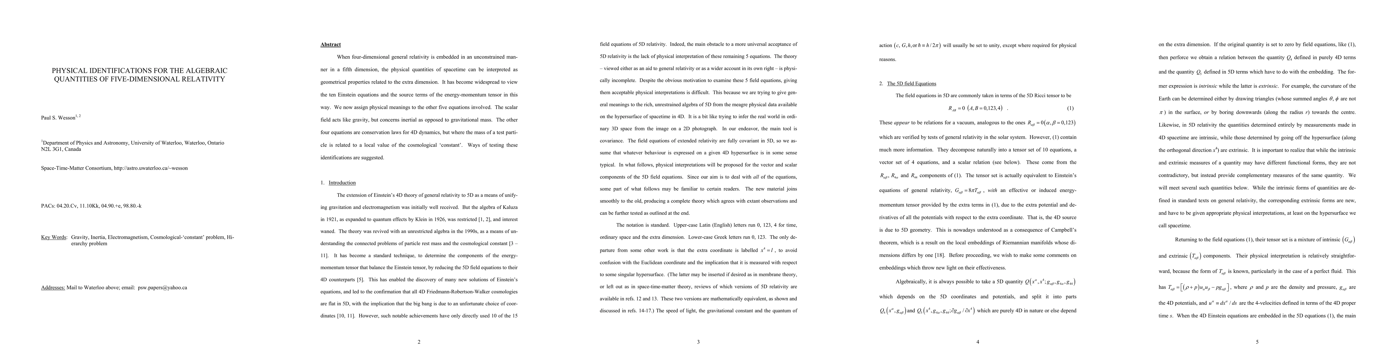 When four-dimensional general relativity is embedded in an unconstrained man-ner in a fifth dimension, the physical quantities of spacetime can be interpreted as geometrical properties related to the extra dimension. It has become widespread to view the ten Einstein equations and the source terms of the energy-momentum tensor in this way. We now assign physical meanings to the other five equations involved. The scalar field acts like gravity, but concerns inertial as opposed to gravitational mass. The other four equations are conservation laws for 4D dynamics, but where the mass of a test particle is related to a local value of the cosmological 'constant'. Ways of testing these identifications are suggested.