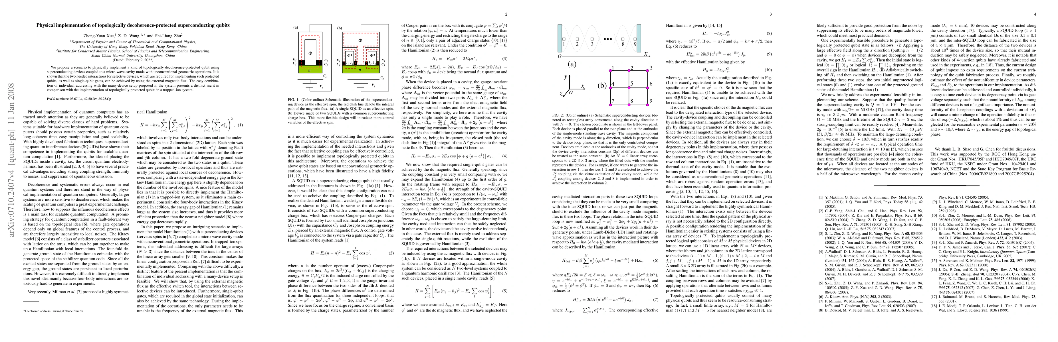 This paper proposes a method to implement topologically decoherence-protected qubits using superconducting devices coupled to a micro-wave cavity, utilizing unconventional geometric operations and external magnetic flux for interactions. The approach offers an easy combination of individual addressing in a many-device setup, presenting advantages over trapped-ion systems.