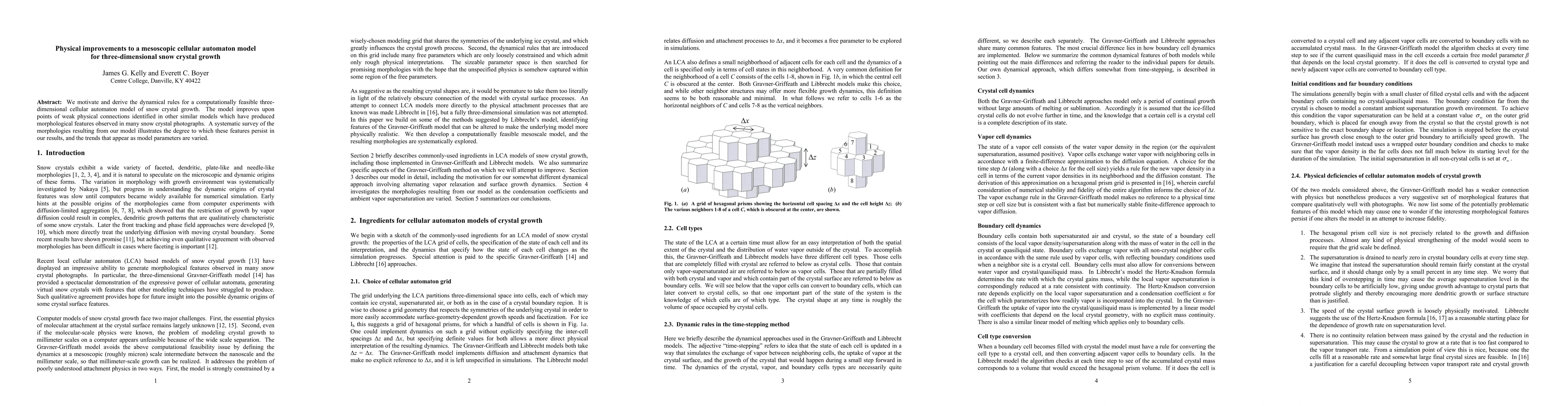 We motivate and derive the dynamical rules for a computationally feasible three-dimensional cellular automaton model of snow crystal growth. The model improves upon points of weak physical connections identified in other similar models which have produced morphological features observed in many snow crystal photographs. A systematic survey of the morphologies resulting from our model illustrates the degree to which these features persist in our results, and the trends that appear as model parameters are varied.