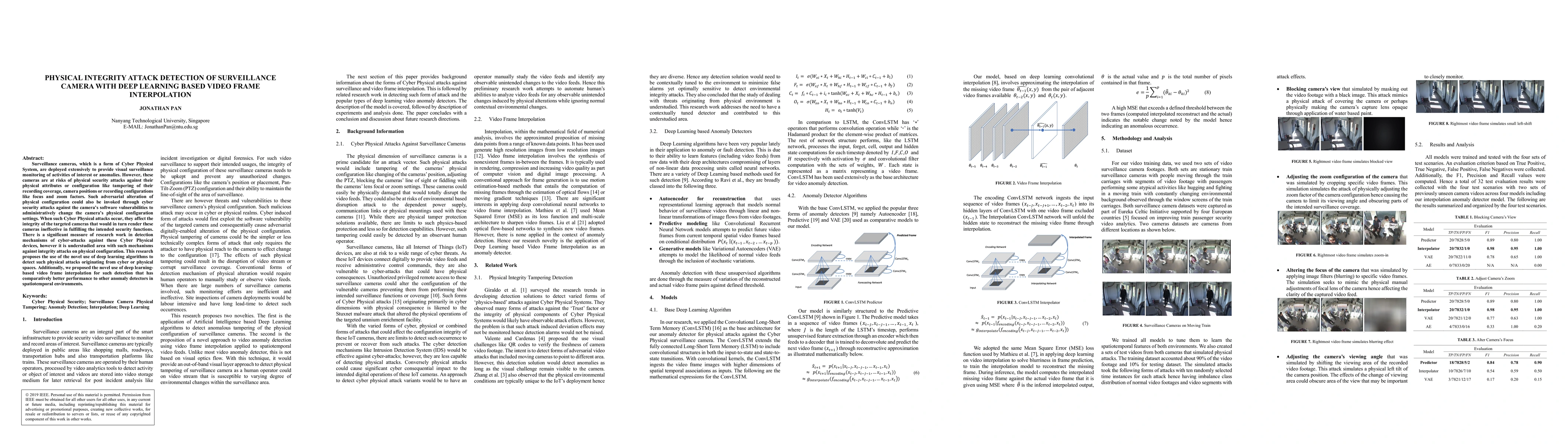 Surveillance cameras, which is a form of Cyber Physical System, are deployed extensively to provide visual surveillance monitoring of activities of interest or anomalies. However, these cameras are at risks of physical security attacks against their physical attributes or configuration like tampering of their recording coverage, camera positions or recording configurations like focus and zoom factors. Such adversarial alteration of physical configuration could also be invoked through cyber security attacks against the camera's software vulnerabilities to administratively change the camera's physical configuration settings. When such Cyber Physical attacks occur, they affect the integrity of the targeted cameras that would in turn render these cameras ineffective in fulfilling the intended security functions. There is a significant measure of research work in detection mechanisms of cyber-attacks against these Cyber Physical devices, however it is understudied area with such mechanisms against integrity attacks on physical configuration. This research proposes the use of the novel use of deep learning algorithms to detect such physical attacks originating from cyber or physical spaces. Additionally, we proposed the novel use of deep learning-based video frame interpolation for such detection that has comparatively better performance to other anomaly detectors in spatiotemporal environments.