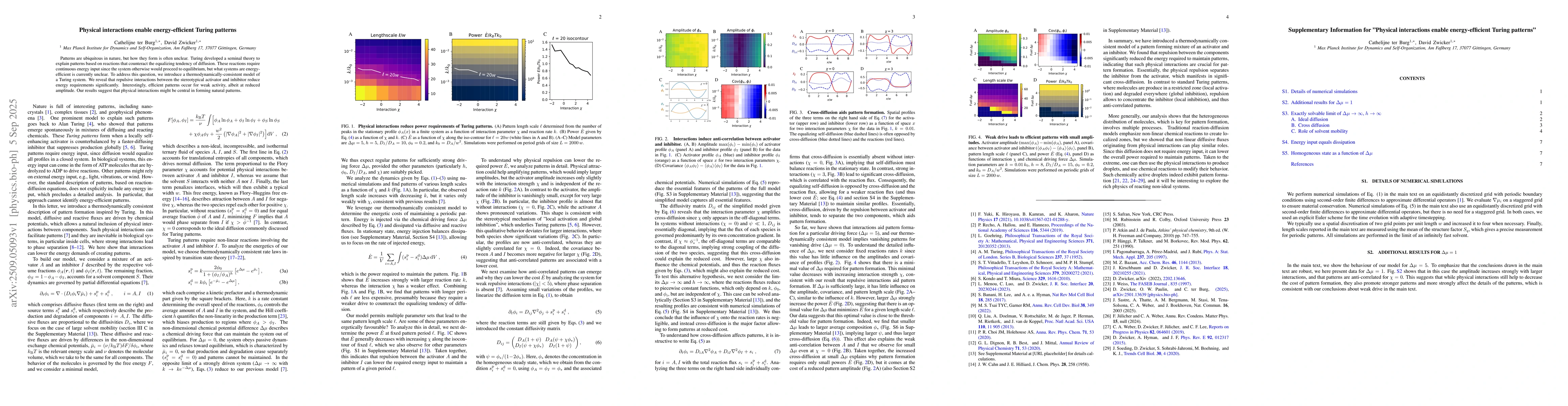 Patterns are ubiquitous in nature, but how they form is often unclear. Turing developed a seminal theory to explain patterns based on reactions that counteract the equalizing tendency of diffusion. These reactions require continuous energy input since the system otherwise would proceed to equilibrium, but what systems are energy-efficient is currently unclear. To address this question, we introduce a thermodynamically-consistent model of a Turing system. We reveal that repulsive interactions between the stereotypical activator and inhibitor reduce energy requirements significantly. Interestingly, efficient patterns occur for weak activity, albeit at reduced amplitude. Our results suggest that physical interactions might be central in forming natural patterns.