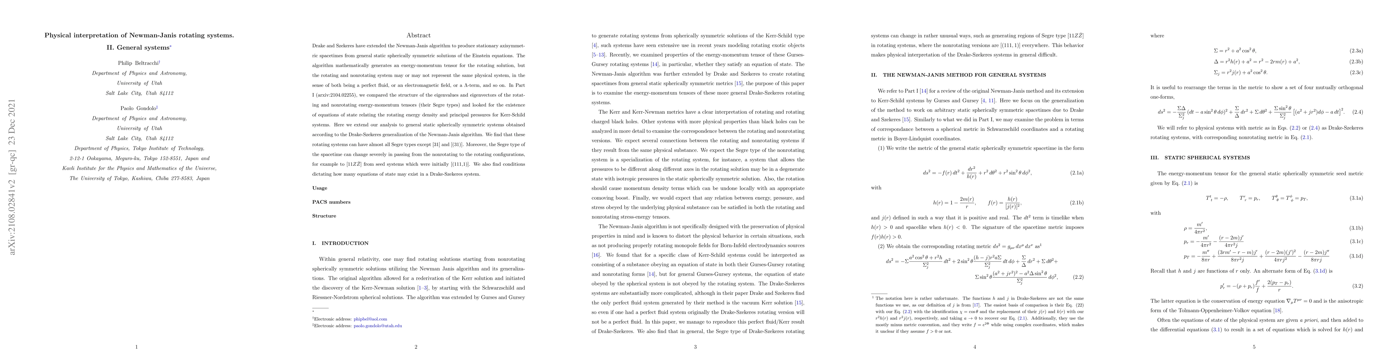 Drake and Szekeres have extended the Newman-Janis algorithm to produce stationary axisymmetric spacetimes from general static spherically symmetric solutions of the Einstein equations. The algorithm mathematically generates an energy-momentum tensor for the rotating solution, but the rotating and nonrotating system may or may not represent the same physical system, in the sense of both being a perfect fluid, or an electromagnetic field, or a $\Lambda$-term, and so on. In Part I (arxiv:2104.02255), we compared the structure of the eigenvalues and eigenvectors of the rotating and nonrotating energy-momentum tensors (their Segre types) and looked for the existence of equations of state relating the rotating energy density and principal pressures for Kerr-Schild systems. Here we extend our analysis to general static spherically symmetric systems obtained according to the Drake-Szekeres generalization of the Newman-Janis algorithm. We find that these rotating systems can have almost all Segre types except [31] and [(31)]. Moreover, the Segre type of the spacetime can change severely in passing from the nonrotating to the rotating configurations, for example to $[11Z\bar{Z}]$ from seed systems which were initially [(111,1)]. We also find conditions dictating how many equations of state may exist in a Drake-Szekeres system.