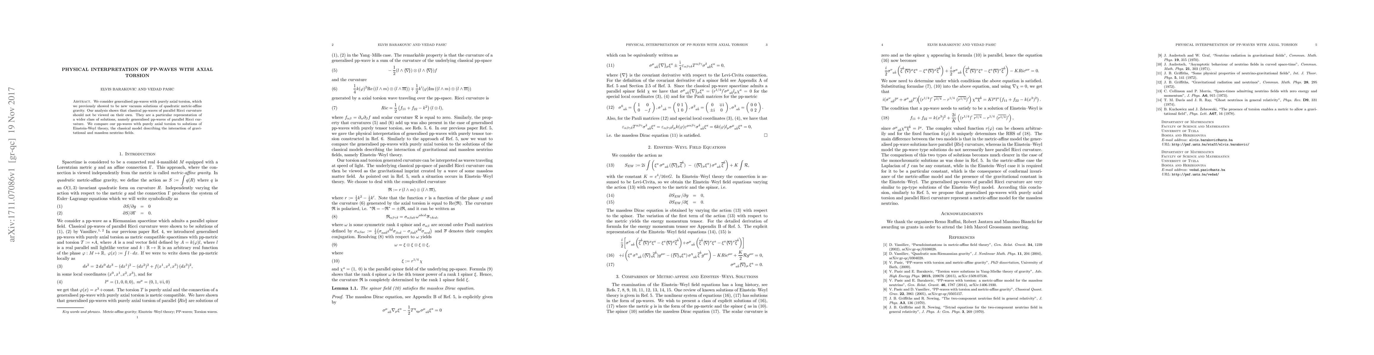 We consider generalised pp-waves with purely axial torsion, which we previously showed to be new vacuum solutions of quadratic metric-affine gravity. Our analysis shows that classical pp-waves of parallel Ricci curvature should not be viewed on their own. They are a particular representation of a wider class of solutions, namely generalised pp-waves of parallel Ricci curvature. We compare our pp-waves with purely axial torsion to solutions of Einstein-Weyl theory, the classical model describing the interaction of gravitational and massless neutrino fields.