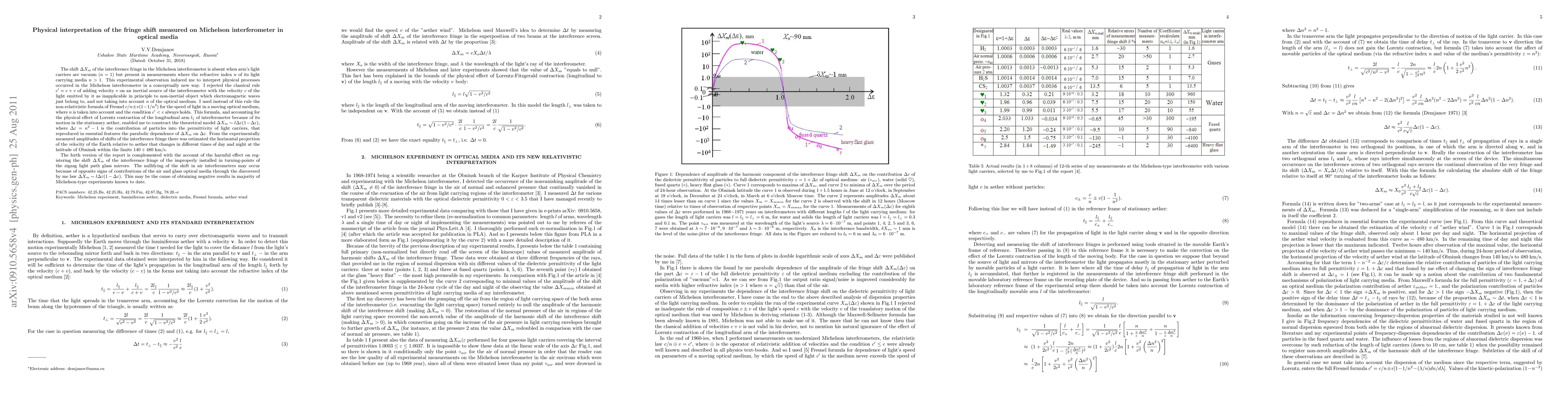 I have found experimentally that in vacuum (refractive index $n$ = 1.) the shift of interference fringe in Michelson interferometer is absent because of the absence of particles on the light path. The shift of interference fringe appears only at a certain concentration of particles in the luminiferous medium. The increase of the remnant air pressure in the optical tubes of the interferometer (of the length 6 m in each arm) from 1 mm Hg to 1500 mm Hg reveals first indications of the interference fringe shift (about 0.015 of its width) only at the air pressure 300 mm Hg ($n$ = 1.00014...). The increase of the air pressure in optical tubes up to 760 mm Hg ($n$ = 1.0003...) adds twice the amplitude of the harmonic shift of the interference fringe giving ~0.03, and at the pressure 1500 mm Hg the harmonic fringe shift ~0.06 became conspicuous. The S-shaped with the change of sign dependence of the fringe shift on the index of refraction $n$ was found. Thus the estimation of the horizontal projection of the velocity of the Earth relative to aether is obtained. At the latitude of Obninsk this velocity varies depending on the time of day and night within 140 - 480 km/s. The forth version of the report is complemented with the account of the harmful effect on registering the shift $\Delta X_m$ of the interference fringe of the improperly installed in turning-points of the zigzag light path glass mirrors. The nullifying of the shift in air interferometers may occur because of opposite signs of contributions of the air and glass optical media through the discovered by me law $\Delta X_m \sim l\Delta\epsilon(1-\Delta\epsilon)$. This may be the cause of obtaining negative results in majority of Michelson-type experiments known to date.