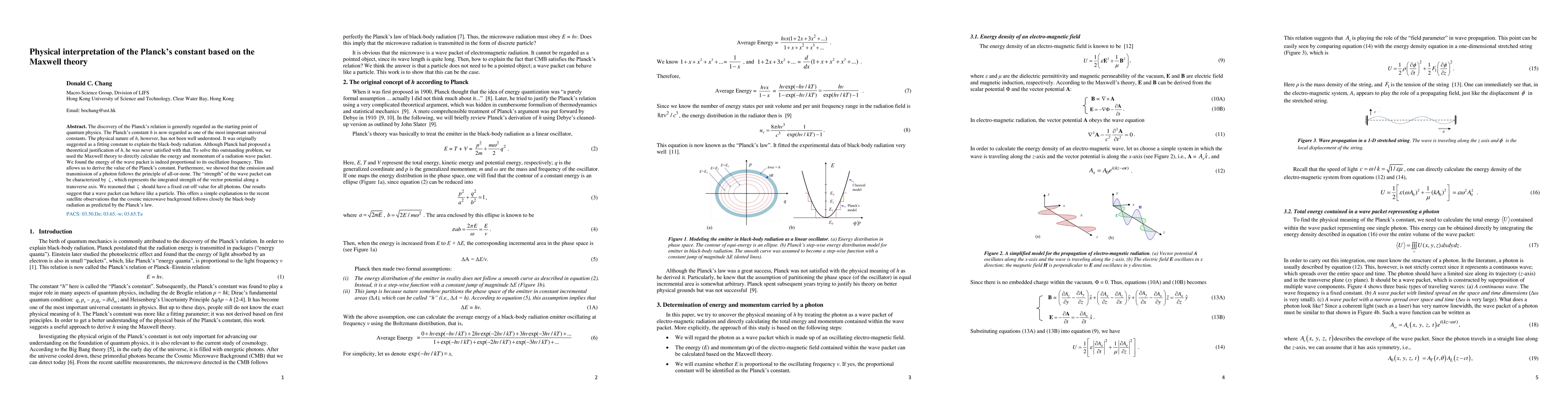 The discovery of the Planck's relation is generally regarded as the starting point of quantum physics. The Planck's constant h is now regarded as one of the most important universal constants. The physical nature of h, however, has not been well understood. It was originally suggested as a fitting constant to explain the black-body radiation. Although Planck had proposed a theoretical justification of h, he was never satisfied with that. To solve this outstanding problem, we used the Maxwell theory to directly calculate the energy and momentum of a radiation wave packet. We found the energy of the wave packet is indeed proportional to its oscillation frequency. This allows us to derive the value of the Planck's constant. Furthermore, we showed that the emission and transmission of a photon follows the principle of all-or-none. The "strength" of the wave packet can be characterized by zeta, which represents the integrated strength of the vector potential along a transverse axis. We reasoned that zeta should have a fixed cut-off value for all photons. Our results suggest that a wave packet can behave like a particle. This offers a simple explanation to the recent satellite observations that the cosmic microwave background follows closely the black-body radiation as predicted by the Planck's law.