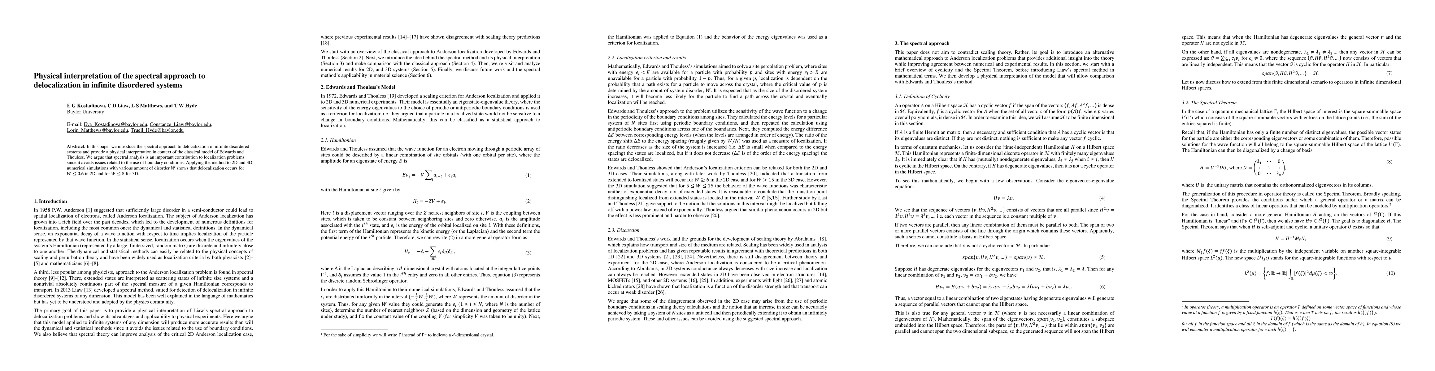 This paper explores the spectral approach to delocalization in infinite disordered systems, offering a physical interpretation aligned with the classical model of Edwards and Thouless. The method avoids boundary condition issues and numerical simulations reveal delocalization for W<=0.6 in 2D and W<=5 in 3D.