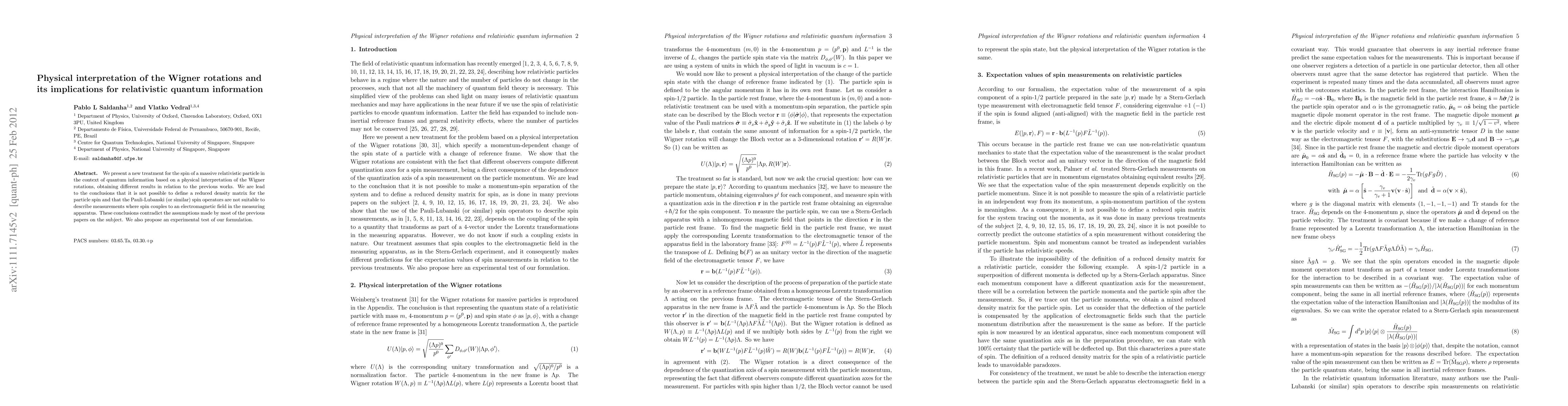 We present a new treatment for the spin of a massive relativistic particle in the context of quantum information based on a physical interpretation of the Wigner rotations, obtaining different results in relation to the previous works. We are lead to the conclusions that it is not possible to define a reduced density matrix for the particle spin and that the Pauli-Lubanski (or similar) spin operators are not suitable to describe measurements where spin couples to an electromagnetic field in the measuring apparatus. These conclusions contradict the assumptions made by most of the previous papers on the subject. We also propose an experimental test of our formulation.