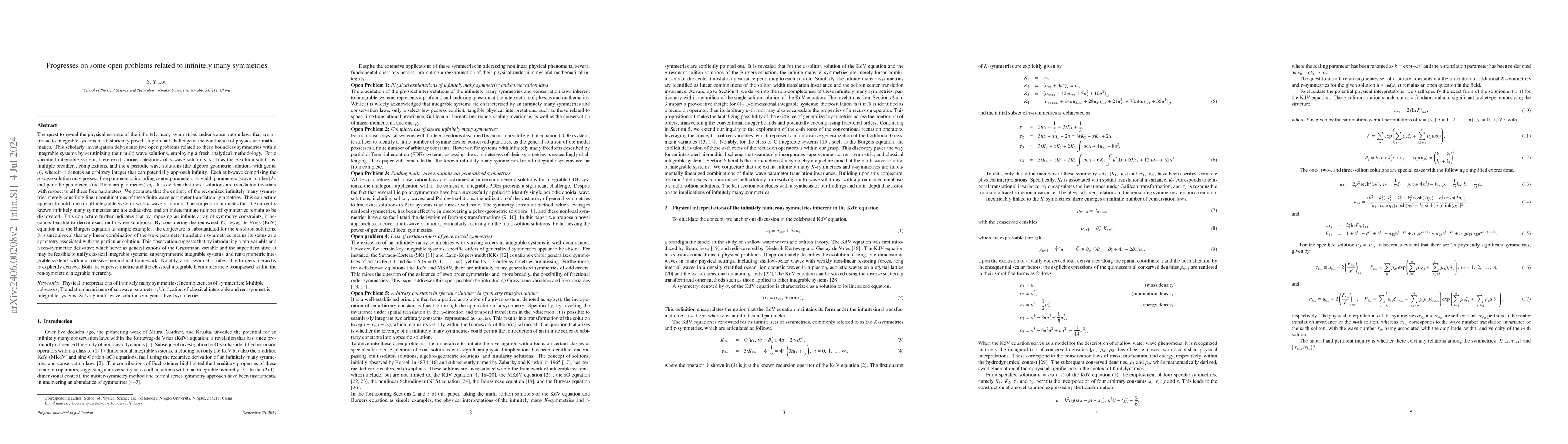 This paper explores the physical interpretations of infinite symmetries in integrable systems, proposing that these symmetries arise from translations of wave parameters. It suggests unifying hierarchies for classical, supersymmetric, and ren-symmetric systems through the introduction of ren-variables and ren-symmetric derivatives, supported by analyses of the KdV and Burgers equations.