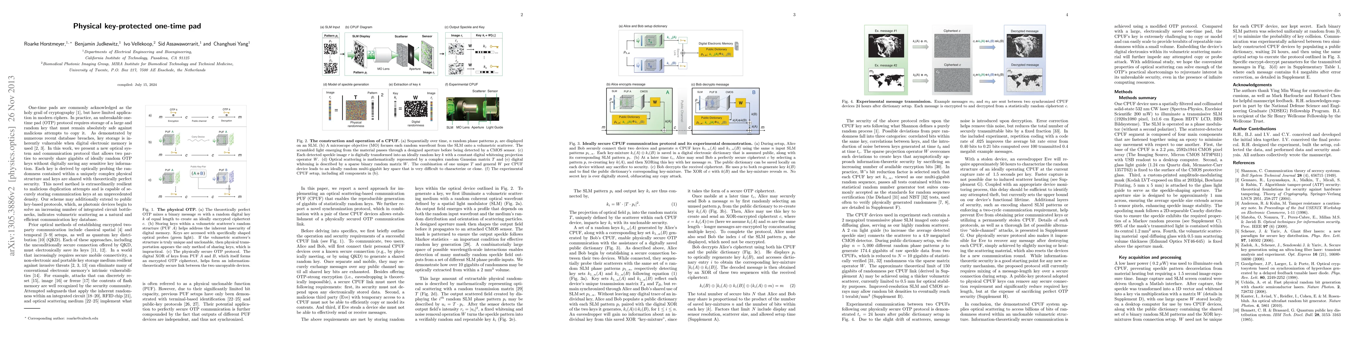 We describe an encrypted communication principle that can form a perfectly secure link between two parties without electronically saving either of their keys. Instead, cryptographic key bits are kept safe within the unique mesoscopic randomness of two volumetric scattering materials. We demonstrate how a shared set of patterned optical probes can generate 10 gigabits of statistically verified randomness between a pair of unique 2 cubic millimeter scattering objects. This shared randomness is used to facilitate information-theoretically secure communication following a modified one-time pad protocol. Benefits of volumetric physical storage over electronic memory include the inability to probe, duplicate or selectively reset any random bits without fundamentally altering the entire key space. Beyond the demonstrated communication scheme, our ability to securely couple the randomness contained within two unique physical objects may help strengthen the hardware for a large class of cryptographic protocols, which is currently a critically weak link in the security pipeline of our increasingly mobile communication culture.