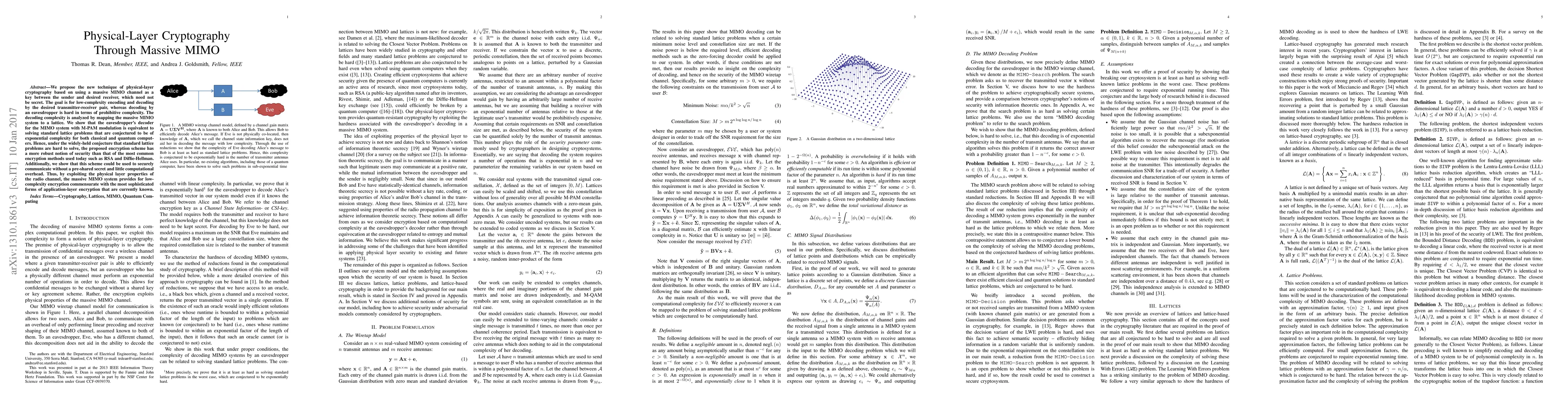 This paper proposes a physical-layer cryptography technique using a massive MIMO channel as a key, enabling low-complexity encryption for a desired transmitter-receiver pair while making decoding by an eavesdropper prohibitively complex. The security is based on the hardness of standard lattice problems, offering a robust alternative to traditional encryption methods.