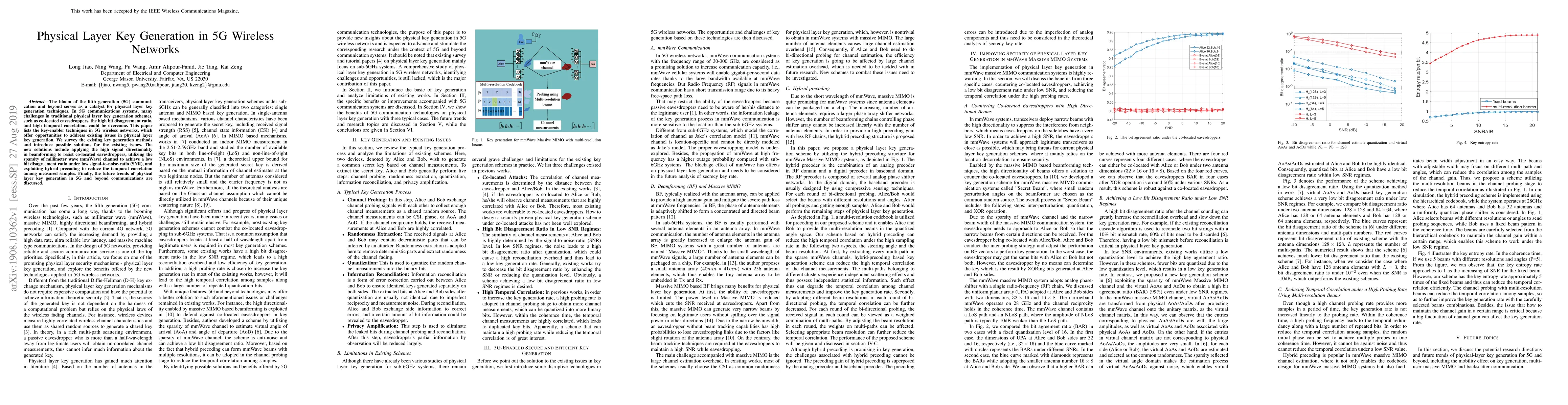 This paper surveys physical layer key generation techniques in 5G networks, addressing challenges such as co-location eavesdropping, high bit disagreement, and temporal correlation. It proposes solutions leveraging beamforming, mmWave channel sparsity, and hybrid precoding, and discusses future trends in this field.