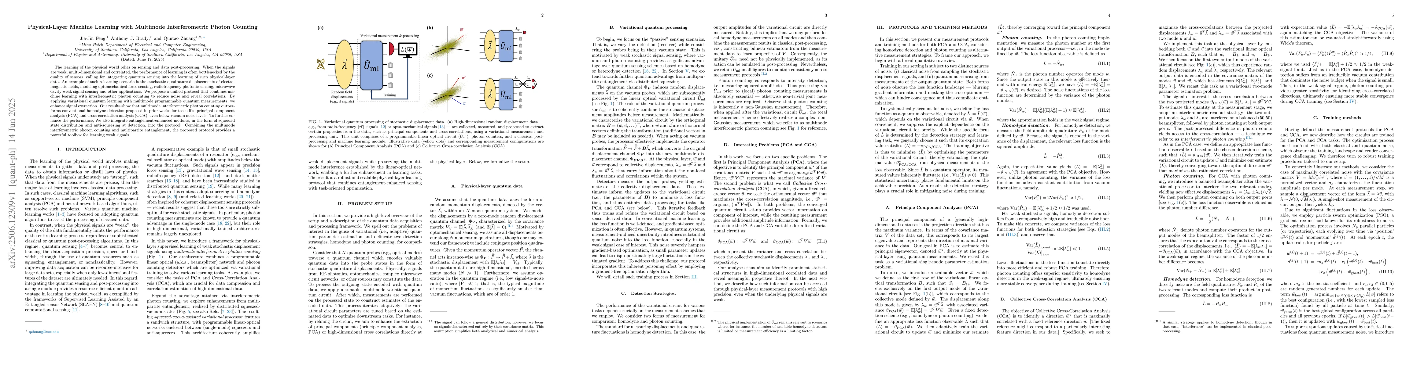 The learning of the physical world relies on sensing and data post-processing. When the signals are weak, multi-dimensional and correlated, the performance of learning is often bottlenecked by the quality of sensors, calling for integrating quantum sensing into the learning of such physical-layer data. An example of such a learning scenario is the stochastic quadrature displacements of electromagnetic fields, modeling optomechanical force sensing, radiofrequency photonic sensing, microwave cavity weak signal sensing and other applications. We propose a unified protocol that combines machine learning with interferometric photon counting to reduce noise and reveal correlations. By applying variational quantum learning with multimode programmable quantum measurements, we enhance signal extraction. Our results show that multimode interferometric photon counting outperforms conventional homodyne detection proposed in prior works for tasks like principal component analysis (PCA) and cross-correlation analysis (CCA), even below vacuum noise levels. To further enhance the performance, We also integrate entanglement-enhanced modules, in the form of squeezed state distribution and anti-squeezing at detection, into the protocol. Combining the multimode interferometric photon counting and multipartite entanglement, the proposed protocol provides a powerful toolbox for learning weak signals.
