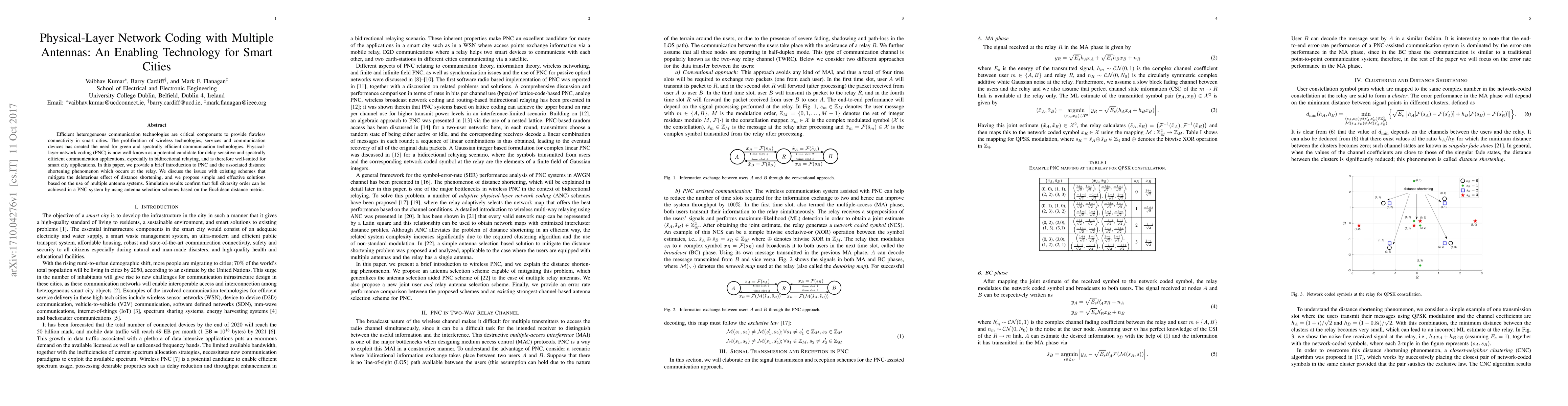 This paper explores physical-layer network coding (PNC) as a green and spectrally efficient communication technology for smart cities. It proposes solutions using multiple antenna systems to mitigate distance shortening issues, achieving full diversity order through antenna selection based on Euclidean distance metrics.