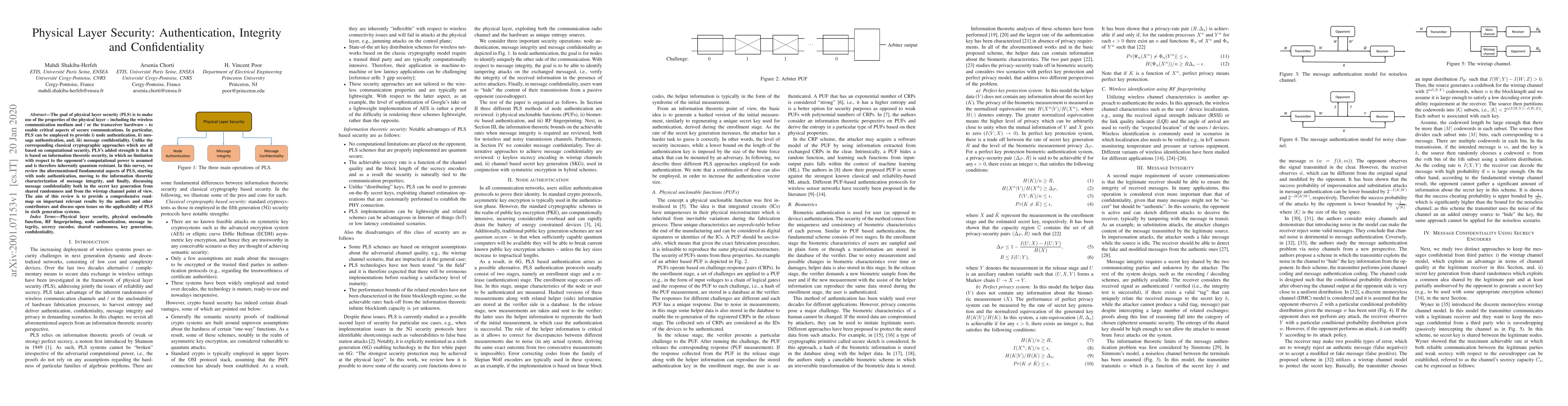 This paper surveys physical layer security (PLS) techniques for node authentication, message integrity, and confidentiality based on information theory, contrasting it with computational security methods. It discusses open issues regarding PLS's application in next-generation communication systems.