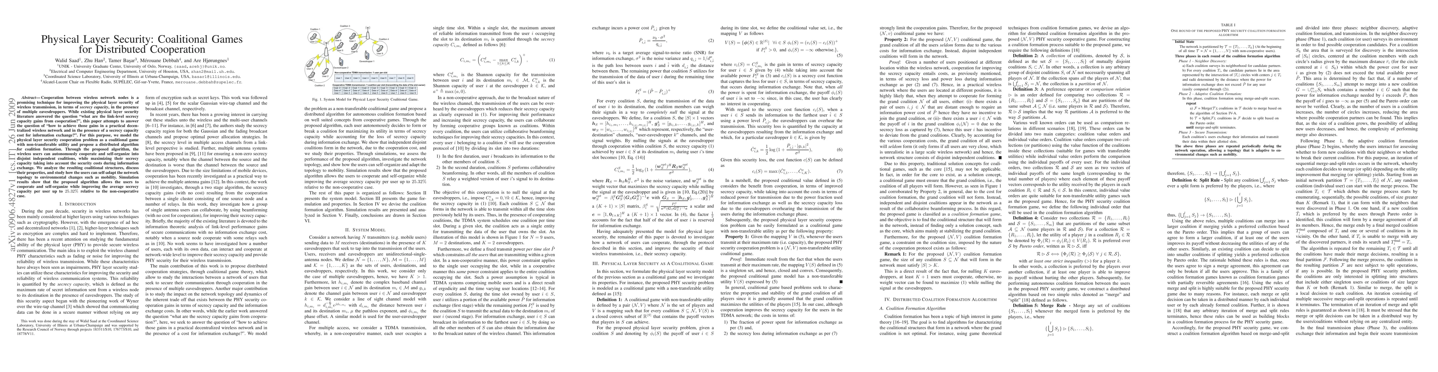 This paper models wireless network cooperation for physical layer security as a coalitional game, proposing a distributed algorithm for coalition formation that enables users to self-organize and maximize secrecy capacity while considering the costs of information exchange. Simulation results indicate a 25.32% improvement in average secrecy capacity per user compared to non-cooperative scenarios.