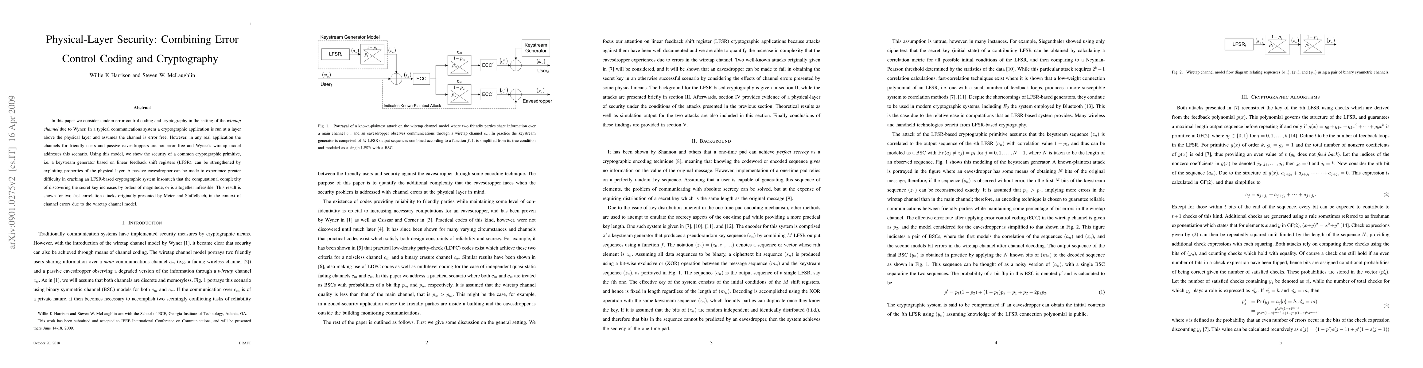 In this paper we consider tandem error control coding and cryptography in the setting of the {\em wiretap channel} due to Wyner. In a typical communications system a cryptographic application is run at a layer above the physical layer and assumes the channel is error free. However, in any real application the channels for friendly users and passive eavesdroppers are not error free and Wyner's wiretap model addresses this scenario. Using this model, we show the security of a common cryptographic primitive, i.e. a keystream generator based on linear feedback shift registers (LFSR), can be strengthened by exploiting properties of the physical layer. A passive eavesdropper can be made to experience greater difficulty in cracking an LFSR-based cryptographic system insomuch that the computational complexity of discovering the secret key increases by orders of magnitude, or is altogether infeasible. This result is shown for two fast correlation attacks originally presented by Meier and Staffelbach, in the context of channel errors due to the wiretap channel model.