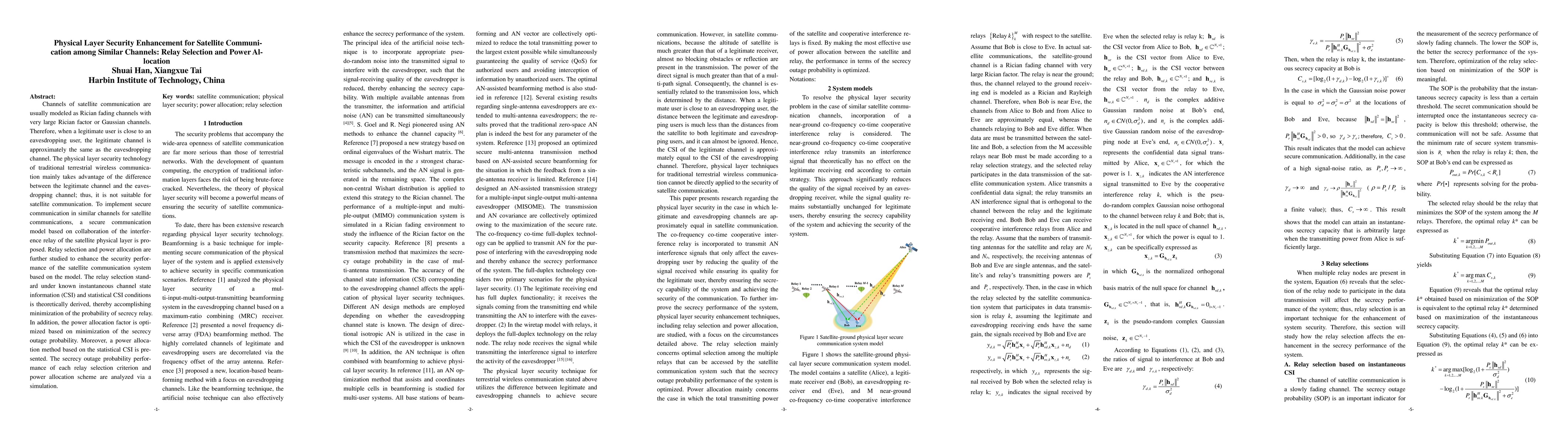 Channels of satellite communication are usually modeled as Rician fading channels with very large Rician factor or Gaussian channels. Therefore, when a legitimate user is close to an eavesdropping user, the legitimate channel is approximately the same as the eavesdropping channel. The physical layer security technology of traditional terrestrial wireless communication mainly takes advantage of the difference be-tween the legitimate channel and the eaves-dropping channel; thus, it is not suitable for satellite communication. To implement secure communication in similar channels for satellite communications, a secure communication mod-el based on collaboration of the interference relay of the satellite physical layer is proposed. Relay selection and power allocation are further studied to enhance the security performance of the satellite communication system based on the model. The relay selection standard under known instantaneous channel state information (CSI) and statistical CSI conditions is theoreti-cally derived, thereby accomplishing minimiza-tion of the probability of secrecy relay. In addi-tion, the power allocation factor is optimized based on minimization of the secrecy outage probability. Moreover, a power allocation method based on the statistical CSI is present-ed. The secrecy outage probability performance of each relay selection criterion and power al-location scheme are analyzed via a simulation.