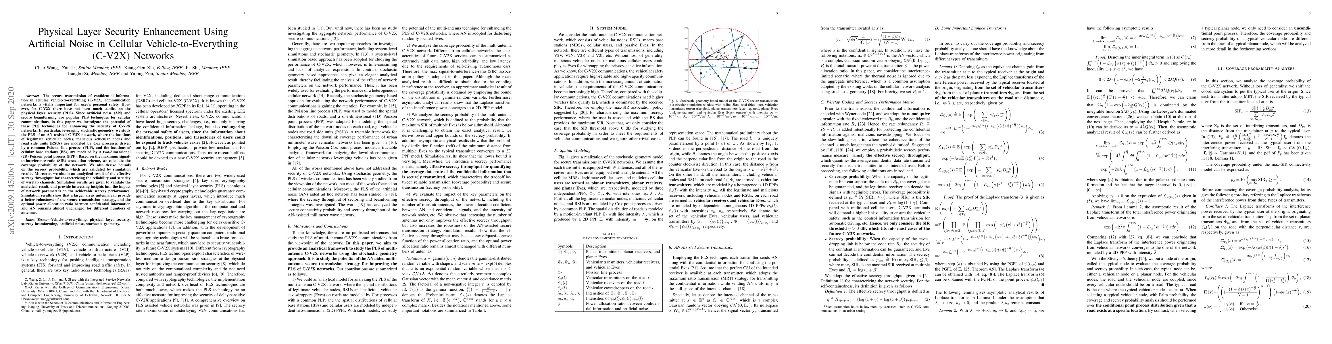 This paper explores the use of artificial noise (AN) and secure beamforming to enhance physical layer security in C-V2X networks, employing stochastic geometry to model network nodes. It derives analytical expressions for coverage probability, secrecy probability, and effective secrecy throughput, validated by simulations that show larger array antennas improve security robustness.