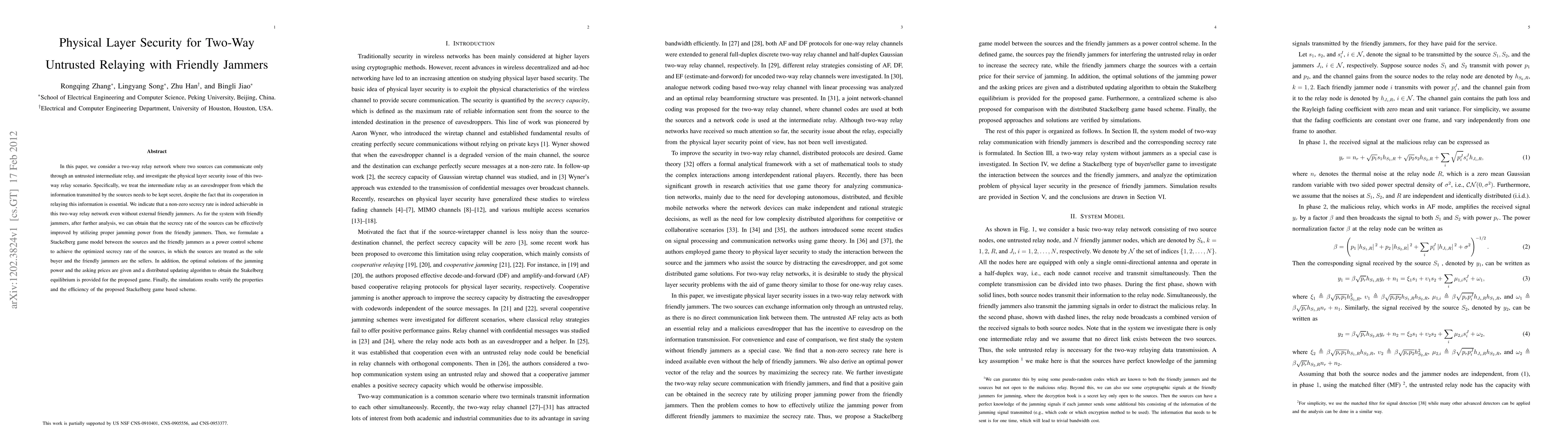 This paper explores physical layer security in a two-way relay network with an untrusted relay, demonstrating achievable secrecy rates without external jammers. It further shows that employing friendly jammers can enhance the secrecy rate, and proposes a Stackelberg game model for optimal power control, providing solutions and a distributed algorithm for equilibrium. Simulation results confirm the scheme's effectiveness.
