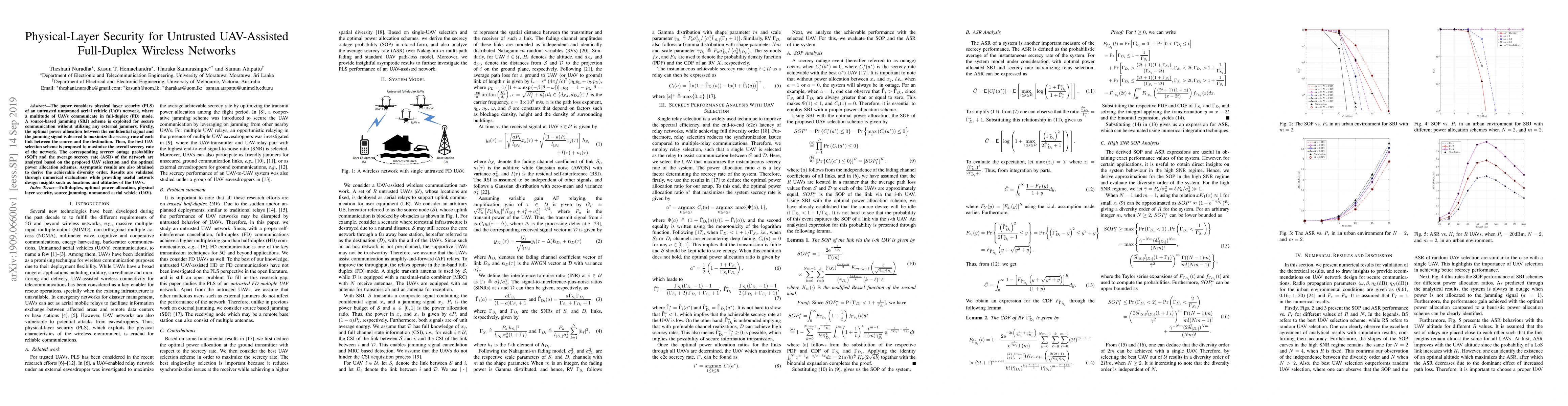 This paper explores physical-layer security in untrusted UAV networks operating in full-duplex mode, utilizing a source-based jamming scheme to enhance security. It proposes optimal power allocation and UAV selection strategies to maximize network secrecy rate, analyzing secrecy outage probability and average secrecy rate, and providing insights for network design.