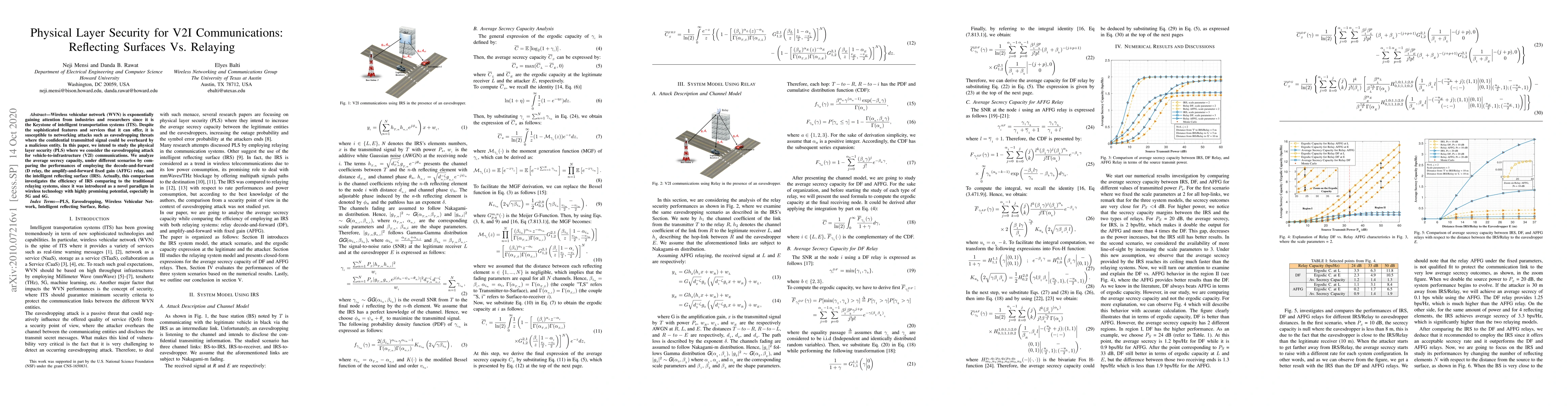 This paper investigates physical layer security in vehicle-to-infrastructure (V2I) communications, comparing the average secrecy capacity of decode-and-forward relay, amplify-and-forward relay, and intelligent reflecting surfaces (IRS) to evaluate the efficiency of IRS against traditional relaying systems. IRS is highlighted as a novel technology with promising potential in future wireless networks.