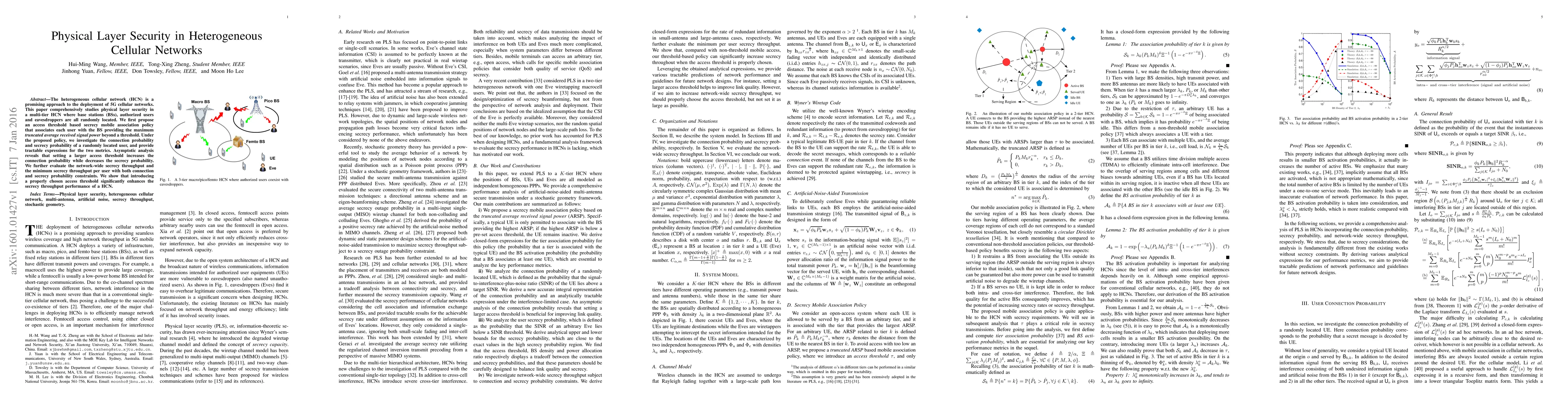 This paper investigates physical layer security in heterogeneous cellular networks (HCNs) by proposing an access threshold-based policy to associate users with base stations. The study finds that while a larger access threshold increases connection probability, it decreases secrecy probability, and demonstrates that an appropriately chosen threshold can significantly enhance network-wide secrecy throughput.