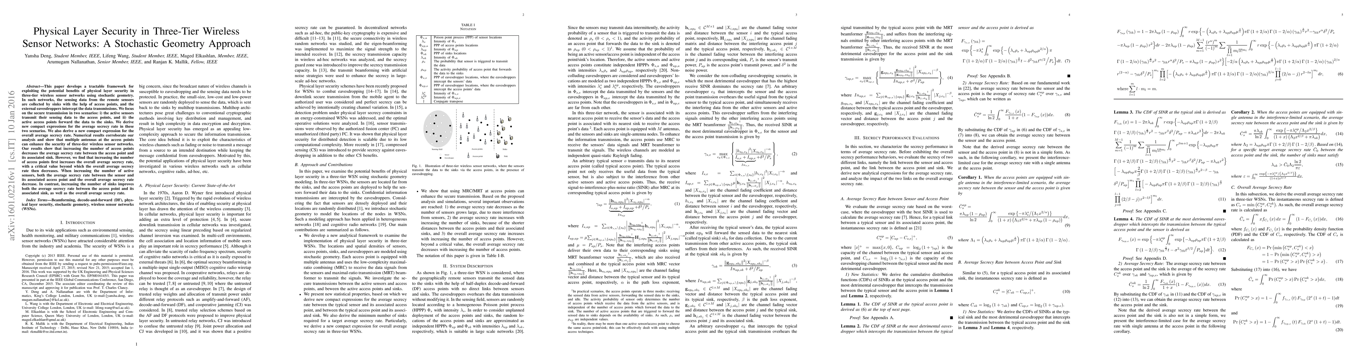 This paper presents a stochastic geometry framework for analyzing physical layer security in three-tier wireless sensor networks, deriving expressions for average secrecy rates in two transmission scenarios. It finds that while multiple antennas enhance security, increasing the number of access points initially boosts but eventually reduces overall network security, while more sinks improve both local and global secrecy rates.