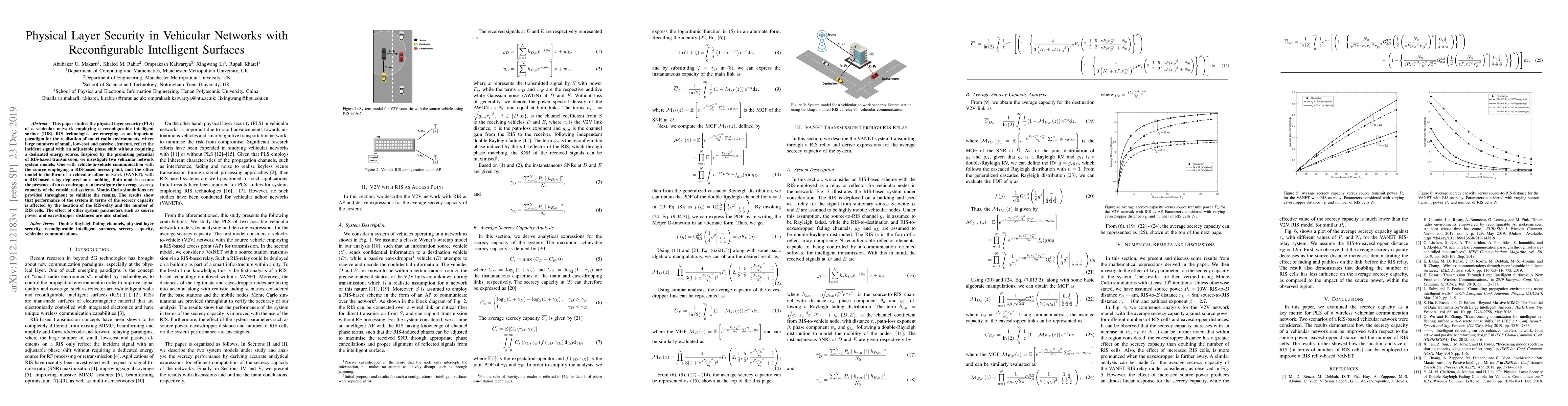 This paper investigates the physical layer security in vehicular networks using reconfigurable intelligent surfaces (RIS), comparing two models: vehicle-to-vehicle communication with a RIS-based access point and a vehicular ad hoc network (VANET) with a RIS-based relay. The study finds that the secrecy capacity is influenced by the RIS location and number of RIS cells, along with source power and eavesdropper distances.