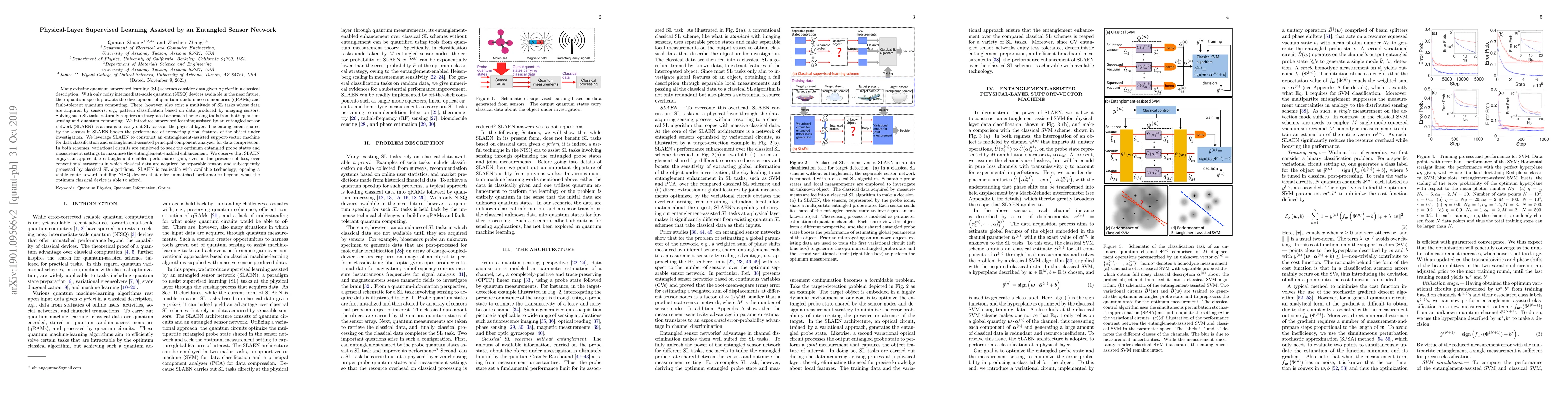 This paper introduces a novel supervised learning method, SLAEN, that leverages entangled sensor networks to enhance physical-layer data processing. By utilizing entanglement to extract global features, SLAEN achieves superior performance in data classification and compression compared to classical methods, even with current noisy quantum devices.