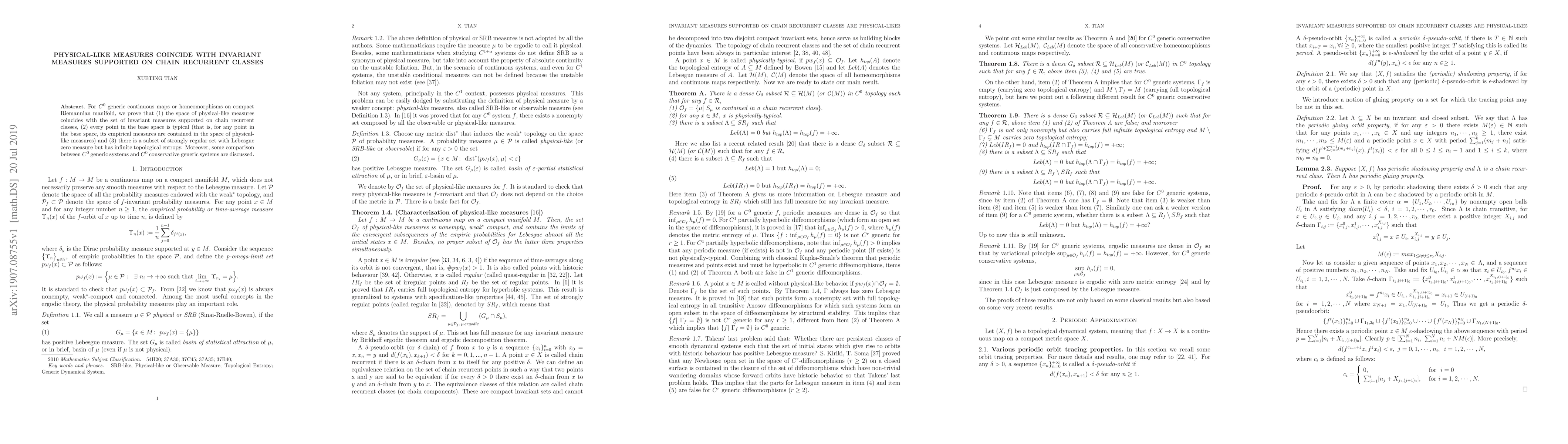 For $C^0$ generic continuous maps or homeomorphisms on compact Riemannian manifold, we prove that (1) the space of physical-like measures coincides with the set of invariant measures supported on chain recurrent classes, (2) every point in the base space is typical (that is, for any point in the base space, its empirical measures are contained in the space of physical-like measures) and (3) there is a subset of strongly regular set with Lebesgue zero measure but has infinite topological entropy. Moreover, some comparison between $C^0$ generic systems and $C^0$ conservative generic systems are discussed.