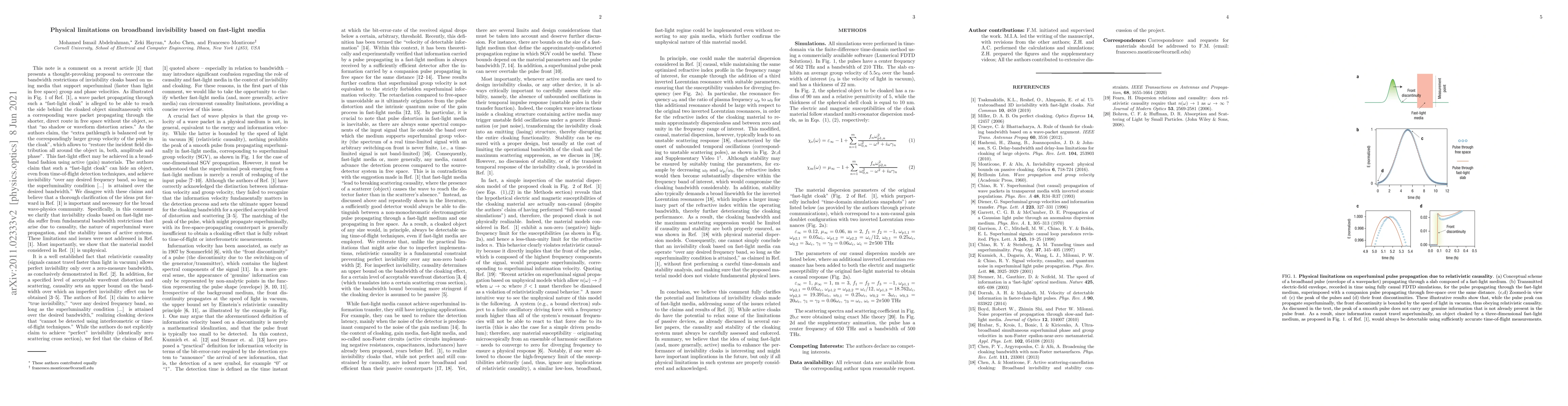 This paper critiques a proposal for broadband invisibility cloaks using fast-light media, arguing that fundamental physical limitations, including causality, superluminal wave propagation, and active system stability, restrict the bandwidth of such cloaks. The authors assert that the material model in the original article is unphysical.