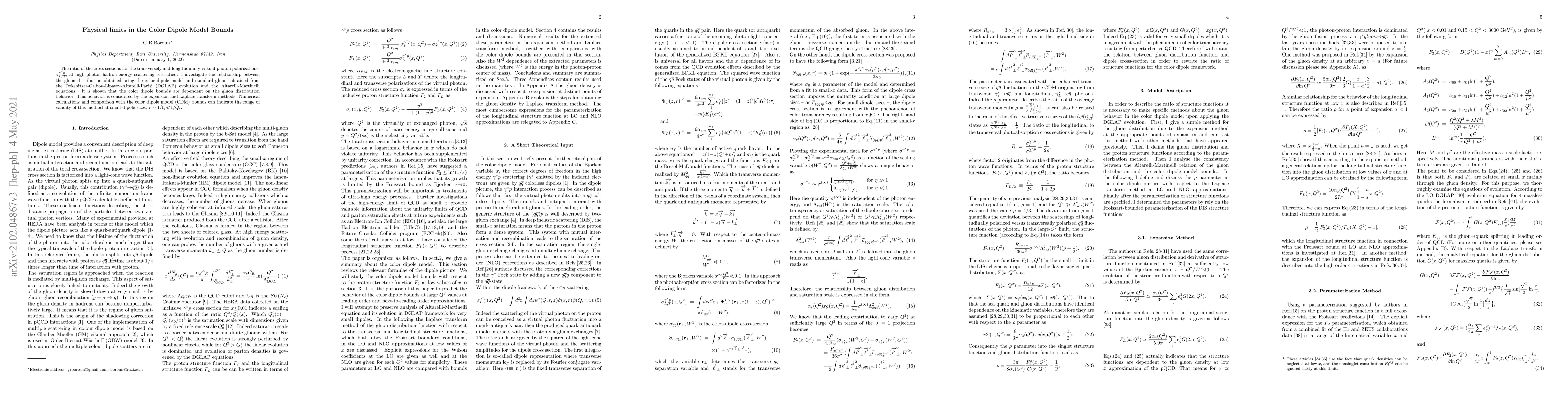 The ratio of the cross sections for the transversely and longitudinally virtual photon polarizations, $\sigma^{\gamma^{*}p}_{L/T}$, at high photon-hadron energy scattering is studied. I investigate the relationship between the gluon distribution obtained using the color dipole model and standard gluons obtained from the Dokshitzer-Gribov-Lipatov-Altarelli-Parisi (DGLAP) evolution and the Altarelli-Martinelli equations. It is shown that the color dipole bounds are dependent on the gluon distribution behavior. This behavior is considered by the expansion and Laplace transform methods. Numerical calculations and comparison with the color dipole model (CDM) bounds can indicate the range of validity of this method at small dipole sizes, $r\sim 1/Q{\ll}1/Q_{s}$.