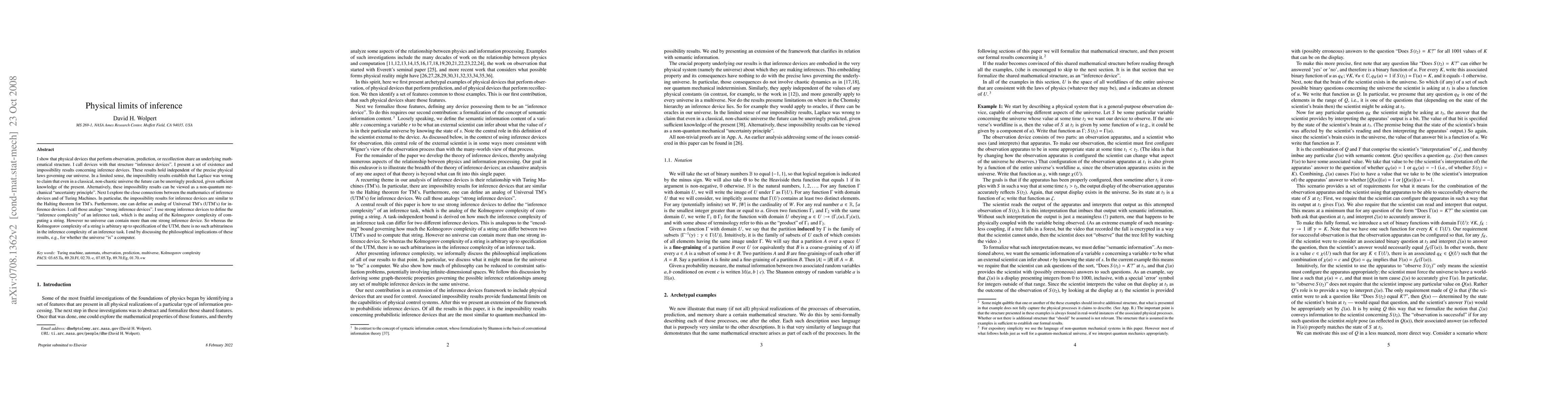 I show that physical devices that perform observation, prediction, or recollection share an underlying mathematical structure. I call devices with that structure "inference devices". I present a set of existence and impossibility results concerning inference devices. These results hold independent of the precise physical laws governing our universe. In a limited sense, the impossibility results establish that Laplace was wrong to claim that even in a classical, non-chaotic universe the future can be unerringly predicted, given sufficient knowledge of the present. Alternatively, these impossibility results can be viewed as a non-quantum mechanical "uncertainty principle". Next I explore the close connections between the mathematics of inference devices and of Turing Machines. In particular, the impossibility results for inference devices are similar to the Halting theorem for TM's. Furthermore, one can define an analog of Universal TM's (UTM's) for inference devices. I call those analogs "strong inference devices". I use strong inference devices to define the "inference complexity" of an inference task, which is the analog of the Kolmogorov complexity of computing a string. However no universe can contain more than one strong inference device. So whereas the Kolmogorov complexity of a string is arbitrary up to specification of the UTM, there is no such arbitrariness in the inference complexity of an inference task. I end by discussing the philosophical implications of these results, e.g., for whether the universe "is" a computer.