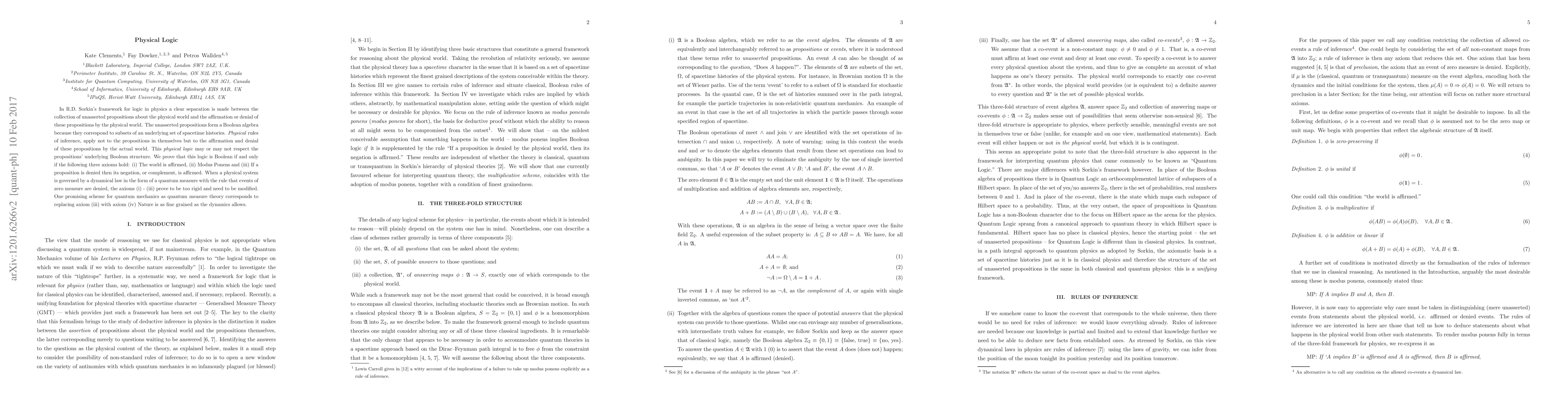 In R.D. Sorkin's framework for logic in physics a clear separation is made between the collection of unasserted propositions about the physical world and the affirmation or denial of these propositions by the physical world. The unasserted propositions form a Boolean algebra because they correspond to subsets of an underlying set of spacetime histories. Physical rules of inference, apply not to the propositions in themselves but to the affirmation and denial of these propositions by the actual world. This physical logic may or may not respect the propositions' underlying Boolean structure. We prove that this logic is Boolean if and only if the following three axioms hold: (i) The world is affirmed, (ii) Modus Ponens and (iii) If a proposition is denied then its negation, or complement, is affirmed. When a physical system is governed by a dynamical law in the form of a quantum measure with the rule that events of zero measure are denied, the axioms (i) - (iii) prove to be too rigid and need to be modified. One promising scheme for quantum mechanics as quantum measure theory corresponds to replacing axiom (iii) with axiom (iv) Nature is as fine grained as the dynamics allows.
