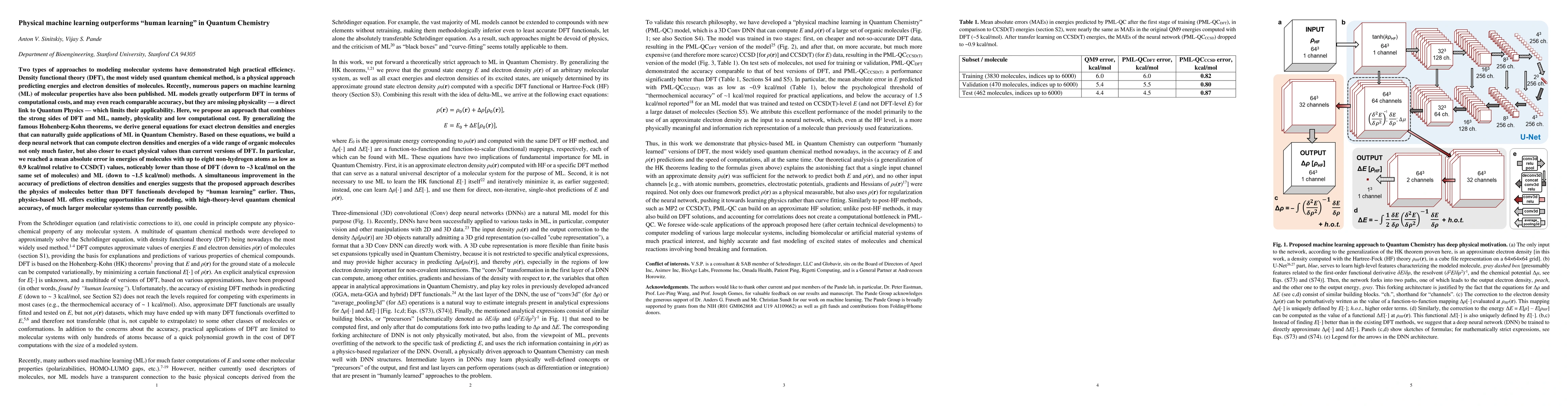Two types of approaches to modeling molecular systems have demonstrated high practical efficiency. Density functional theory (DFT), the most widely used quantum chemical method, is a physical approach predicting energies and electron densities of molecules. Recently, numerous papers on machine learning (ML) of molecular properties have also been published. ML models greatly outperform DFT in terms of computational costs, and may even reach comparable accuracy, but they are missing physicality - a direct link to Quantum Physics - which limits their applicability. Here, we propose an approach that combines the strong sides of DFT and ML, namely, physicality and low computational cost. By generalizing the famous Hohenberg-Kohn theorems, we derive general equations for exact electron densities and energies that can naturally guide applications of ML in Quantum Chemistry. Based on these equations, we build a deep neural network that can compute electron densities and energies of a wide range of organic molecules not only much faster, but also closer to exact physical values than current versions of DFT. In particular, we reached a mean absolute error in energies of molecules with up to eight non-hydrogen atoms as low as 0.9 kcal/mol relative to CCSD(T) values, noticeably lower than those of DFT (down to ~3 kcal/mol on the same set of molecules) and ML (down to ~1.5 kcal/mol) methods. A simultaneous improvement in the accuracy of predictions of electron densities and energies suggests that the proposed approach describes the physics of molecules better than DFT functionals developed by "human learning" earlier. Thus, physics-based ML offers exciting opportunities for modeling, with high-theory-level quantum chemical accuracy, of much larger molecular systems than currently possible.