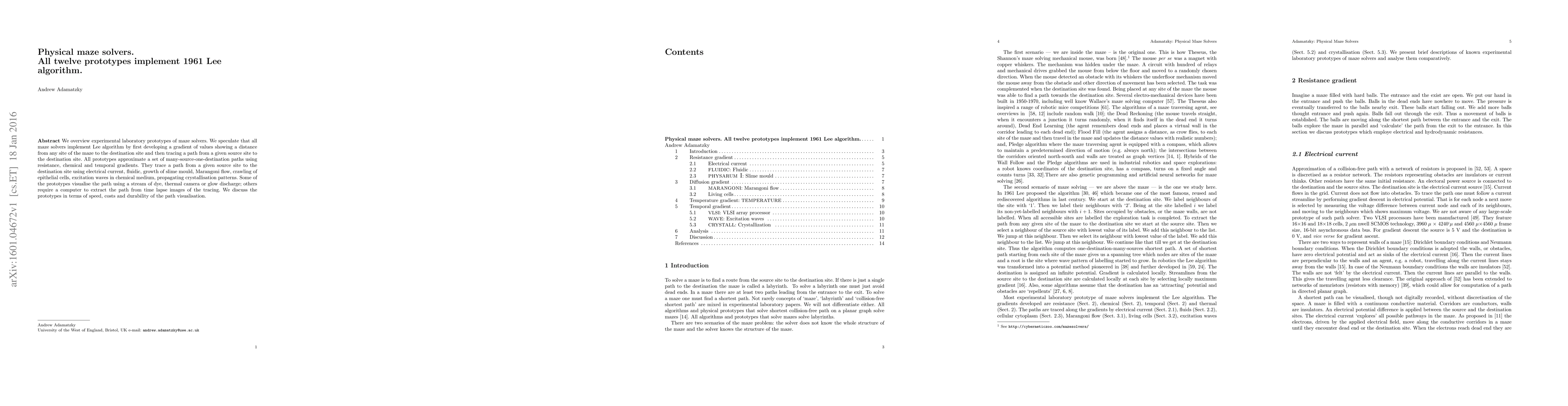 This paper presents twelve experimental prototypes of physical maze solvers that implement the 1961 Lee algorithm, tracing paths from source to destination using various physical gradients. The prototypes utilize diverse methods such as electrical current, fluidic flow, and biological growth, with some visualizing paths through dye streams or thermal imaging.