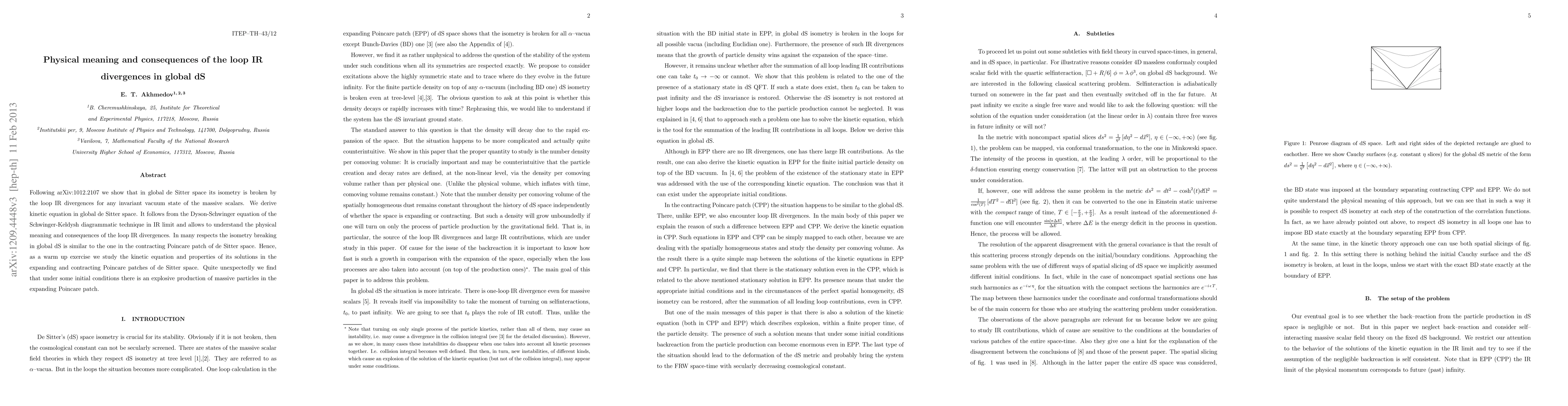 Following arXiv:1012.2107 we show that in global de Sitter space its isometry is broken by the loop IR divergences for any invariant vacuum state of the massive scalars. We derive kinetic equation in global de Sitter space. It follows from the Dyson-Schwinger equation of the Schwinger-Keldysh diagrammatic technique in IR limit and allows to understand the physical meaning and consequences of the loop IR divergences. In many respects the isometry breaking in global dS is similar to the one in the contracting Poincare patch of de Sitter space. Hence, as a warm up exercise we study the kinetic equation and properties of its solutions in the expanding and contracting Poincare patches of de Sitter space. Quite unexpectedly we find that under some initial conditions there is an explosive production of massive particles in the expanding Poincare patch.