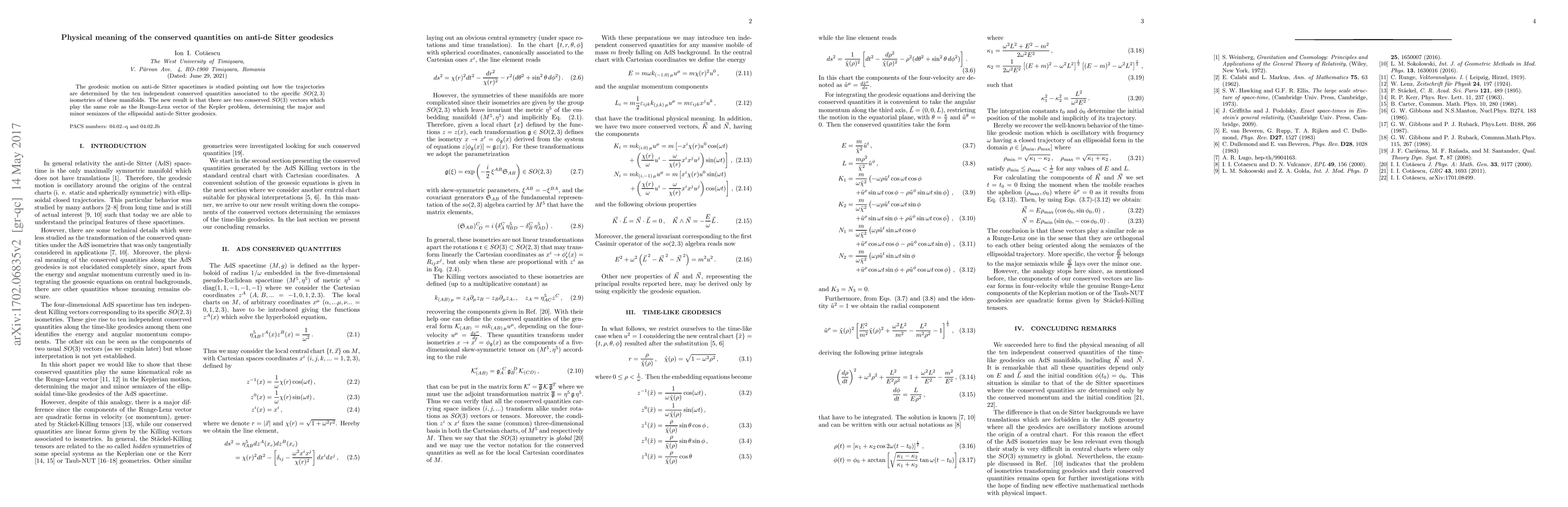 This paper investigates geodesic motion in anti-de Sitter spacetimes, revealing ten conserved quantities tied to the SO(2,3) symmetries. It introduces two new conserved SO(3) vectors analogous to the Runge-Lenz vector, which determine the shape of elliptical geodesics.