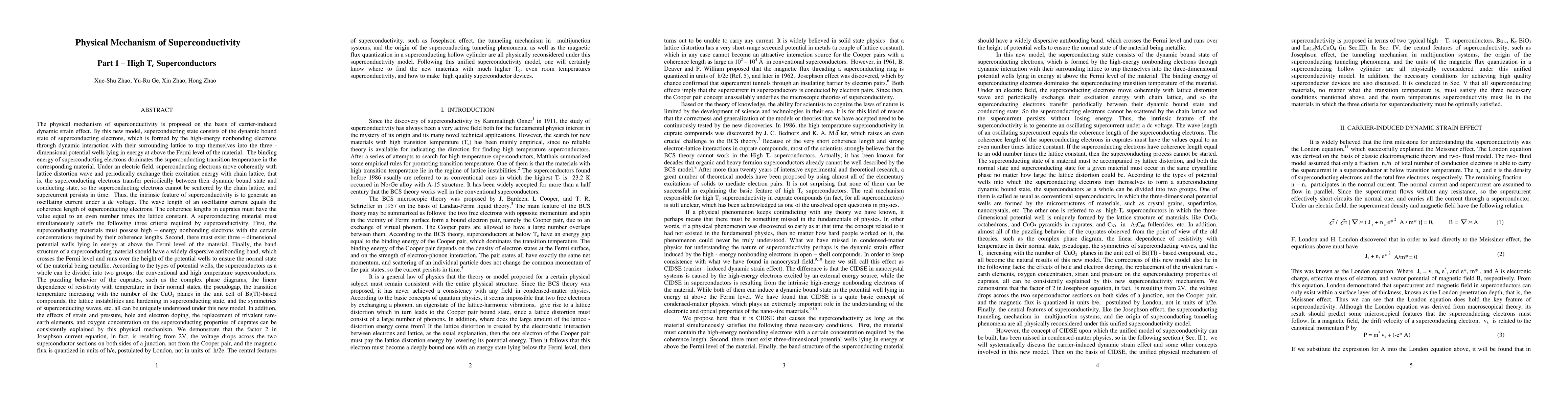 The physical mechanism of superconductivity is proposed on the basis of carrier-induced dynamic strain effect. By this new model, superconducting state consists of the dynamic bound state of superconducting electrons, which is formed by the high-energy nonbonding electrons through dynamic interaction with their surrounding lattice to trap themselves into the three - dimensional potential wells lying in energy at above the Fermi level of the material. The binding energy of superconducting electrons dominates the superconducting transition temperature in the corresponding material. Under an electric field, superconducting electrons move coherently with lattice distortion wave and periodically exchange their excitation energy with chain lattice, that is, the superconducting electrons transfer periodically between their dynamic bound state and conducting state. Thus, the intrinsic feature of superconductivity is to generate an oscillating current under a dc voltage. The coherence lengths in cuprates must have the value equal to an even number times the lattice constant. A superconducting material must simultaneously satisfy three criteria required by superconductivity. Almost all of the puzzling behavior of the cuprates can be uniquely understood under this new model. We demonstrate that the factor 2 in Josephson current equation, in fact, is resulting from 2V, the voltage drops across the two superconductor sections on both sides of a junction, not from the Cooper pair, and the magnetic flux is quantized in units of h/e, postulated by London, not in units of h/2e. The central features of superconductivity, such as Josephson effect, the tunneling mechanism in multijunction systems, and the origin of the superconducting tunneling phenomena, are all physically reconsidered under this superconductivity model.