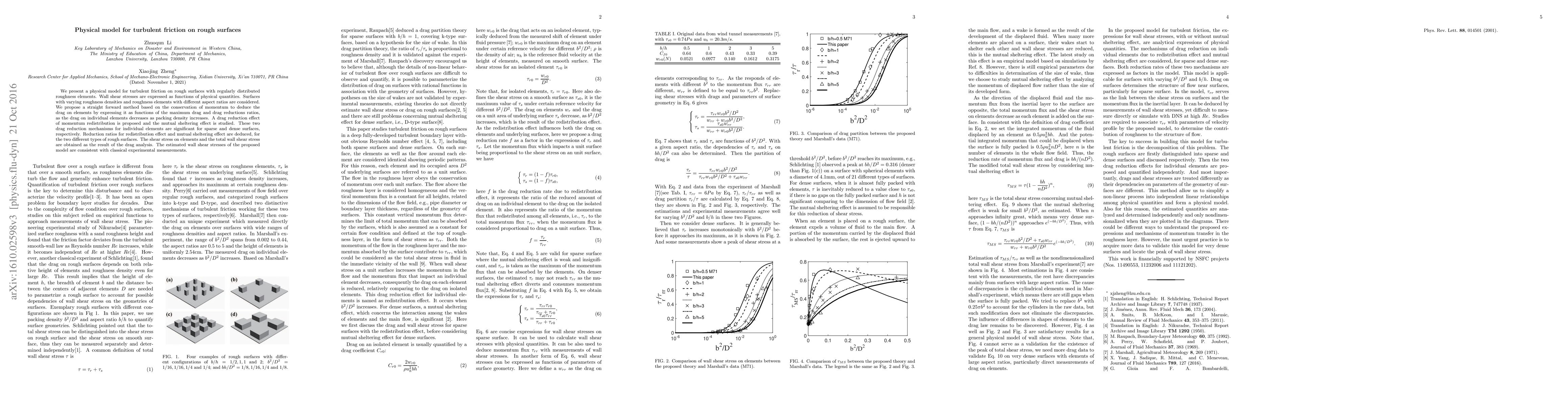 This paper develops a physical model for turbulent friction on rough surfaces, considering varying roughness densities and aspect ratios. The model proposes drag reduction mechanisms, including momentum redistribution and mutual sheltering, and aligns well with experimental measurements.