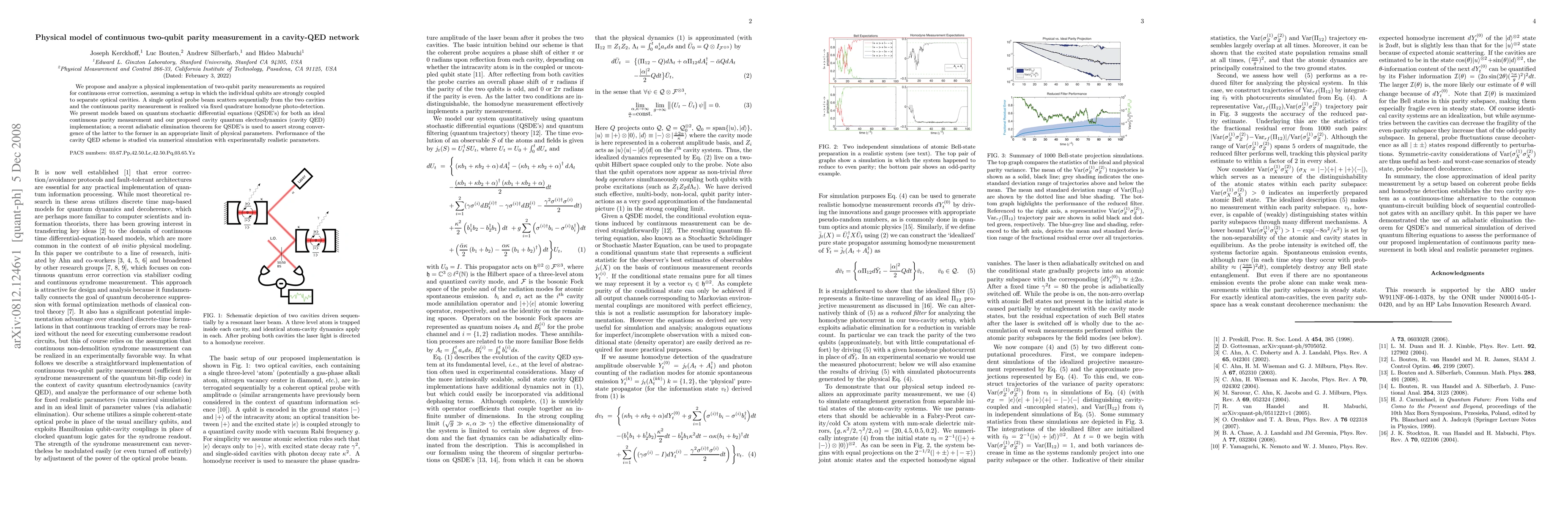 We propose and analyze a physical implementation of two-qubit parity measurements as required for continuous error correction, assuming a setup in which the individual qubits are strongly coupled to separate optical cavities. A single optical probe beam scatters sequentially from the two cavities and the continuous parity measurement is realized via fixed quadrature homodyne photo-detection. We present models based on quantum stochastic differential equations (QSDE's) for both an ideal continuous parity measurement and our proposed cavity quantum electrodynamics (cavity QED) implementation; a recent adiabatic elimination theorem for QSDE's is used to assert strong convergence of the latter to the former in an appropriate limit of physical parameters. Performance of the cavity QED scheme is studied via numerical simulation with experimentally realistic parameters.