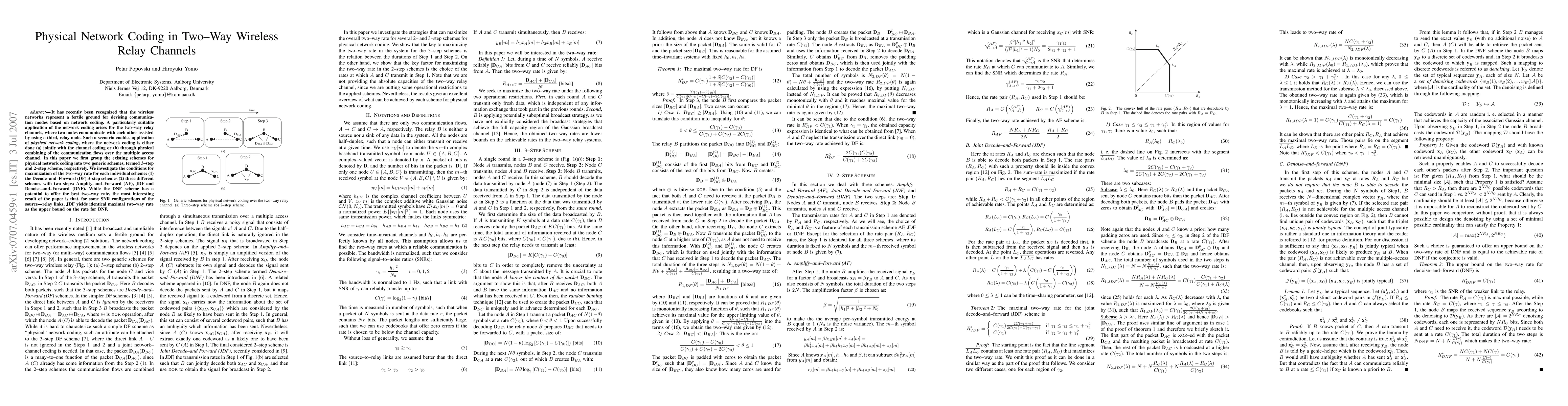 This paper explores physical network coding in two-way wireless relay channels, categorizing existing schemes into 3-step and 2-step methods. It finds that while the Denoise-and-Forward scheme potentially offers the best rate, the Joint Decode-and-Forward scheme can achieve the same maximal rate as the upper bound for certain signal-to-noise ratios.