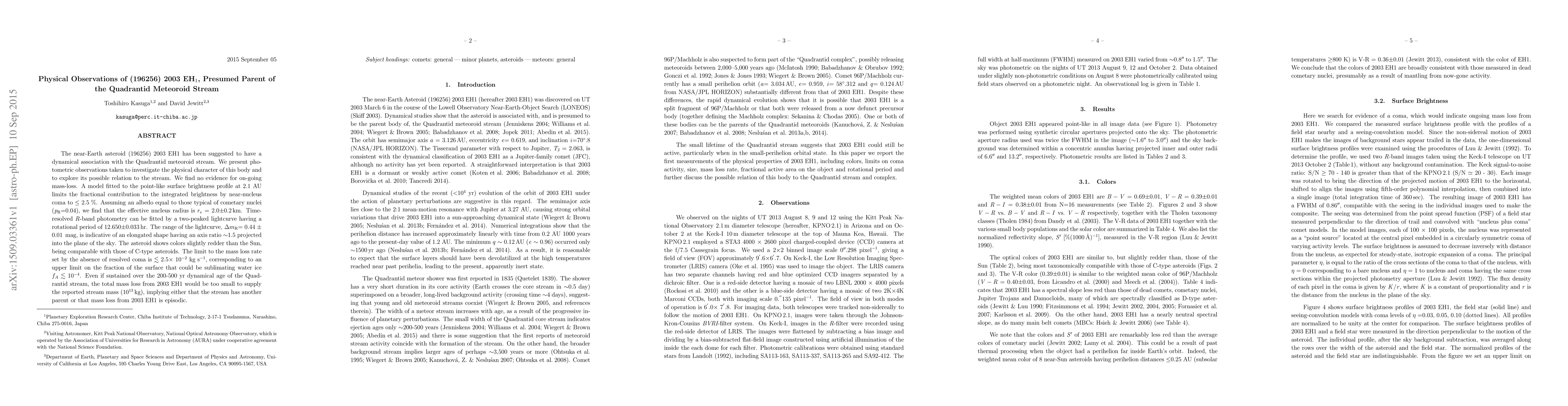 The study of asteroid (196256) 2003 EH1, a candidate parent of the Quadrantid meteoroid stream, found no evidence of ongoing mass-loss. Photometric observations determined its size (2.0±0.2 km), rotational period (12.650±0.033 hr), and elongated shape. The asteroid's mass-loss rate limit was set at <<2.5 x 10^-2 kg s^-1>>, implying insufficient mass loss to supply the Quadrantid stream, suggesting either a different parent or episodic mass loss from 2003 EH1.