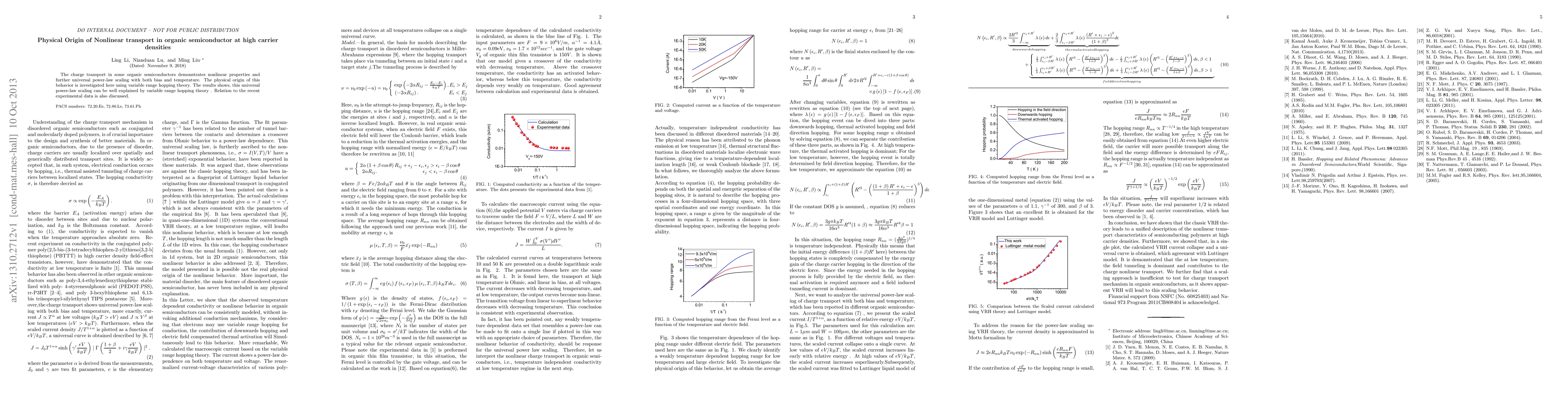 The charge transport in some organic semiconductors demonstrates nonlinear properties and further universal power-law scaling with both bias and temperature. The physical origin of this behavior is investigated here using variable range hopping theory. The results shows, this universal power-law scaling can be well explained by variable range hopping theory . Relation to the recent experimental data is also discussed.