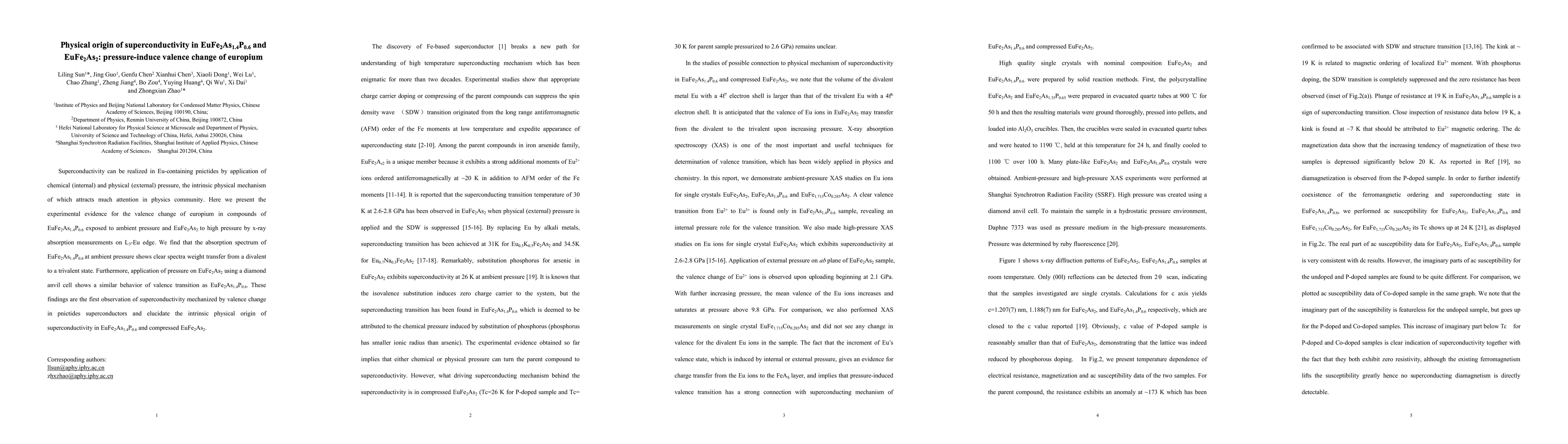 Superconductivity can be realized in Eu-containing pnictides by application of chemical (internal) and physical (external) pressure, the intrinsic physical mechanism of which attracts much attention in physics community. Here we present the experimental evidence for the valence change of europium in compounds of EuFe2As1.4P0.6 exposed to ambient pressure and EuFe2As2 to high pressure by x-ray absorption measurements on L3-Eu edge. We find that the absorption spectrum of EuFe2As1.4P0.6 at ambient pressure shows clear spectra weight transfer from a divalent to a trivalent state. Furthermore, application of pressure on EuFe2As2 using a diamond anvil cell shows a similar behavior of valence transition as EuFe2As1.4P0.6. These findings are the first observation of superconductivity mechanized by valence change in pnictides superconductors and elucidate the intrinsic physical origin of superconductivity in EuFe2As1.4P0.6 and compressed EuFe2As2.