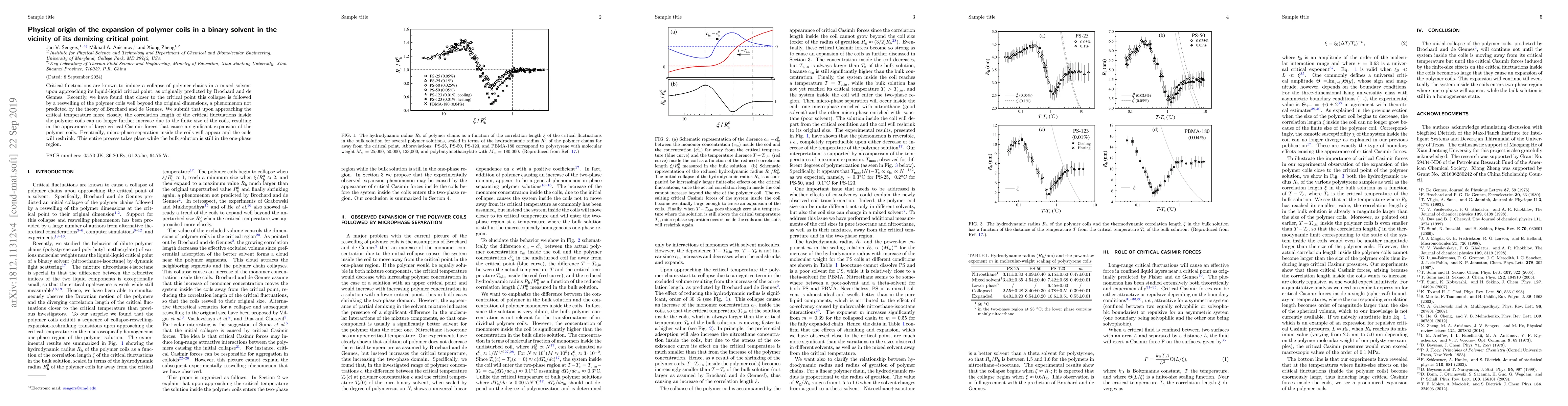 This paper investigates the unexpected expansion of polymer coils near the demixing critical point in a binary solvent, revealing a phenomenon not predicted by existing theories. The authors propose that critical Casimir forces arise due to the finite size of the coils, leading to an expansion before micro-phase separation occurs and the coils eventually reshrink.