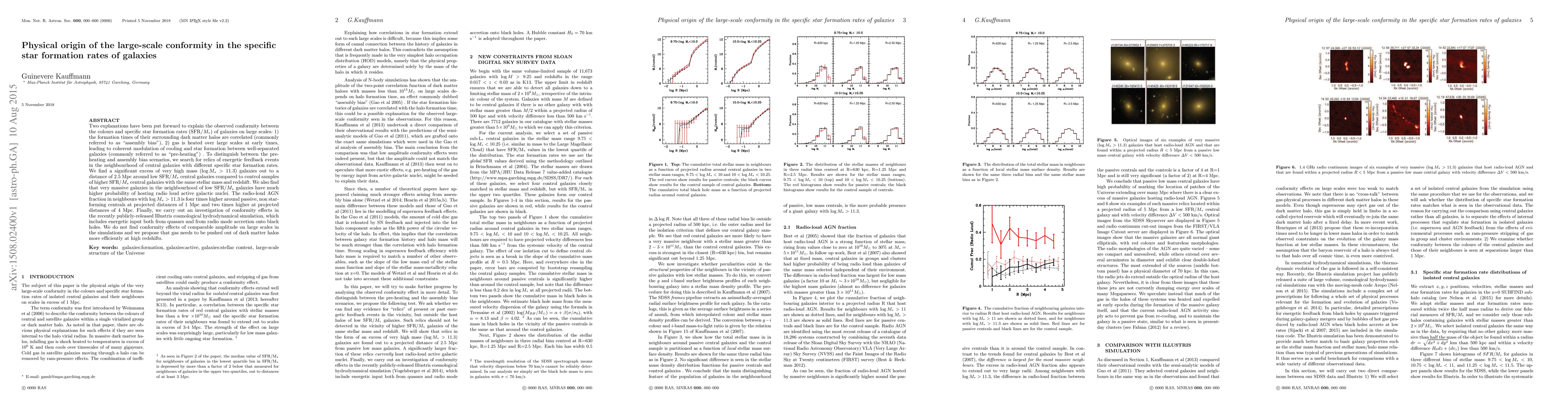 Two explanations have been put forward to explain the observed conformity between the colours and specific star formation rates (SFR/$M_*$) of galaxies on large scales: 1) the formation times of their surrounding dark matter halos are correlated (commonly referred to as "assembly bias"), 2) gas is heated over large scales at early times, leading to coherent modulation of cooling and star formation between well-separated galaxies (commonly referred to as "pre-heating") . To distinguish between the pre-heating and assembly bias scenarios, we search for relics of energetic feedback events in the neighbourhood of central galaxies with different specific star formation rates. We find a significant excess of very high mass ($\log M_* > 11.3$) galaxies out to a distance of 2.5 Mpc around low SFR/$M_*$ central galaxies compared to control samples of higher SFR/$M_*$ central galaxies with the same stellar mass and redshift. We also find that very massive galaxies in the neighbourhood of low SFR/$M_*$ galaxies have much higher probability of hosting radio loud active galactic nuclei. The radio-loud AGN fraction in neighbours with $\log M_* > 11.3$ is four times higher around passive, non star-forming centrals at projected distances of 1 Mpc and two times higher at projected distances of 4 Mpc. Finally, we carry out an investigation of conformity effects in the recently publicly-released Illustris cosmological hydrodynamical simulation, which includes energetic input both from quasars and from radio mode accretion onto black holes. We do not find conformity effects of comparable amplitude on large scales in the simulations and we propose that gas needs to be pushed out of dark matter halos more efficiently at high redshifts.